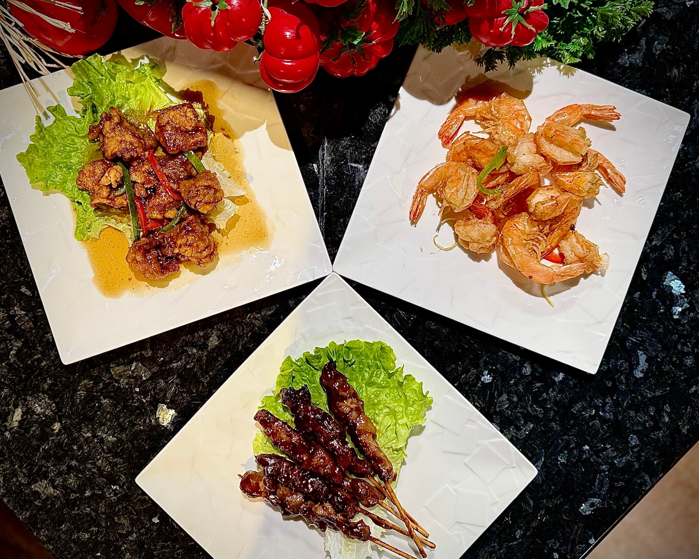 2 pcs nems au poulet, 2 pcs samoussa au boeuf, 2 pcs gyoza au poulet, 2 pcs crevettres potatoes, 2 pcs tempuras crevettes€12.50Buy 1, get 1 freePoulet croustillant