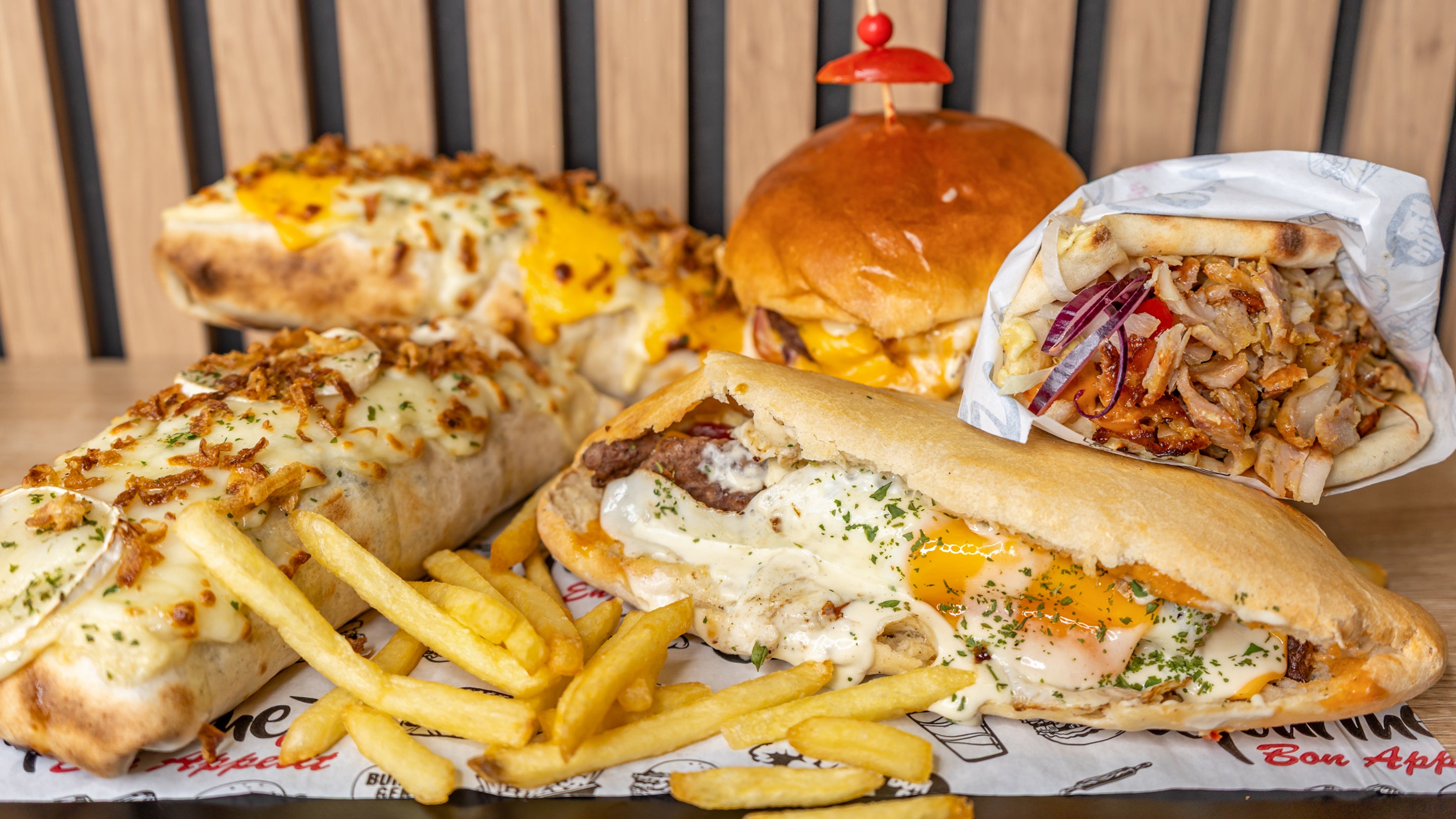 Pain naan, steak, salade, tomate, cheddar.€8.90