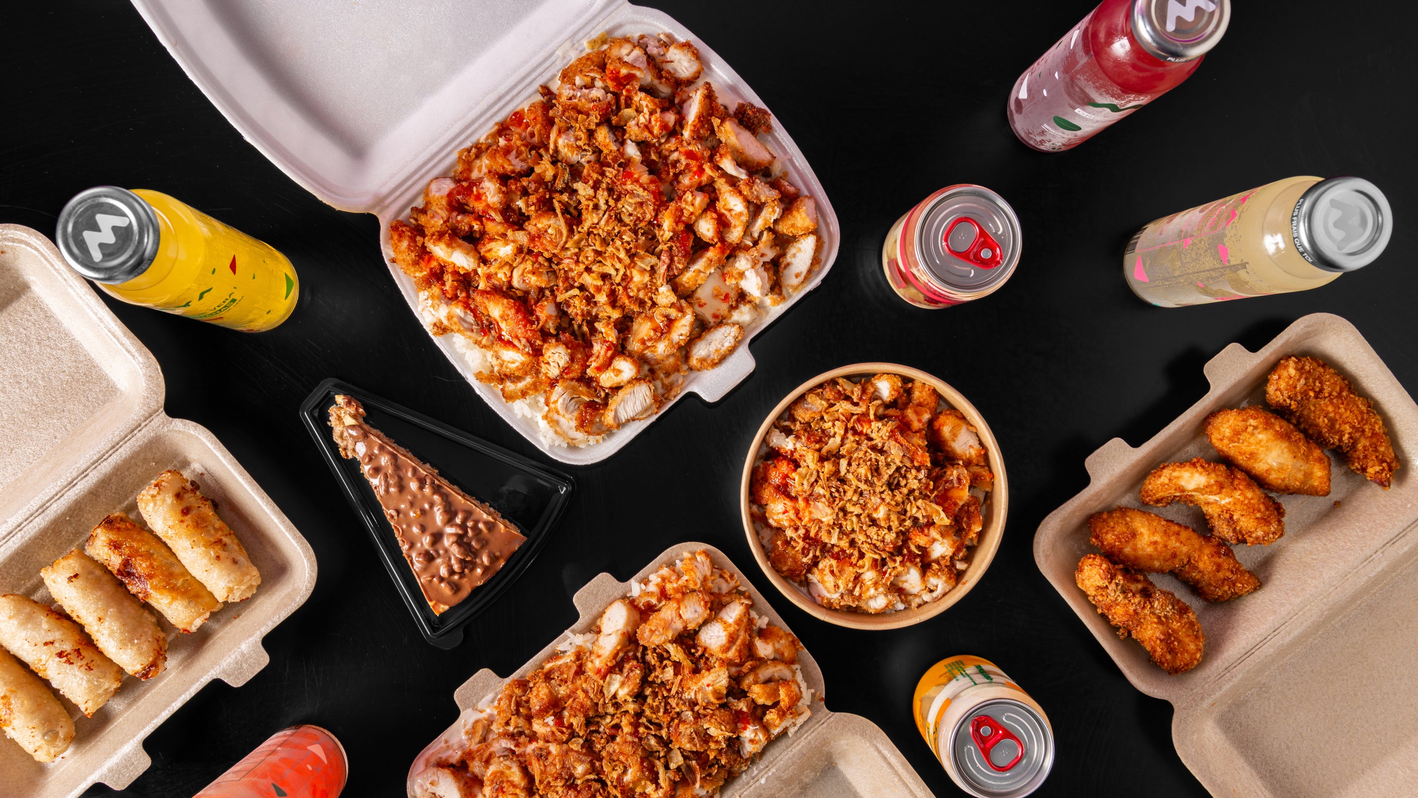 Riz blanc parfumé avec sauce maison,Poulet Kroustyllant Oignons crispy. + 3 sauces au choix€12.16PopularTaille M