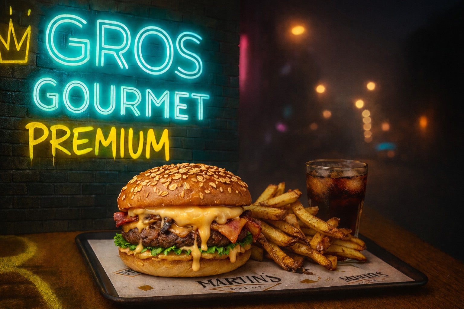 Highly rated· Les incontournables de chez Martin’s dans un menu XXL ! 😍🍔➡️ Un Burger Prémium ultra généreux (avec possibilité d’ajouter tes ingrédients préférés),un accompagnement au choix,une sauce maison pleine de saveurs,et une boisson bien fraîche 🤤🔥Le tout dans un format gourmand et fait maison qui régale à coup sûr 💥€17.90