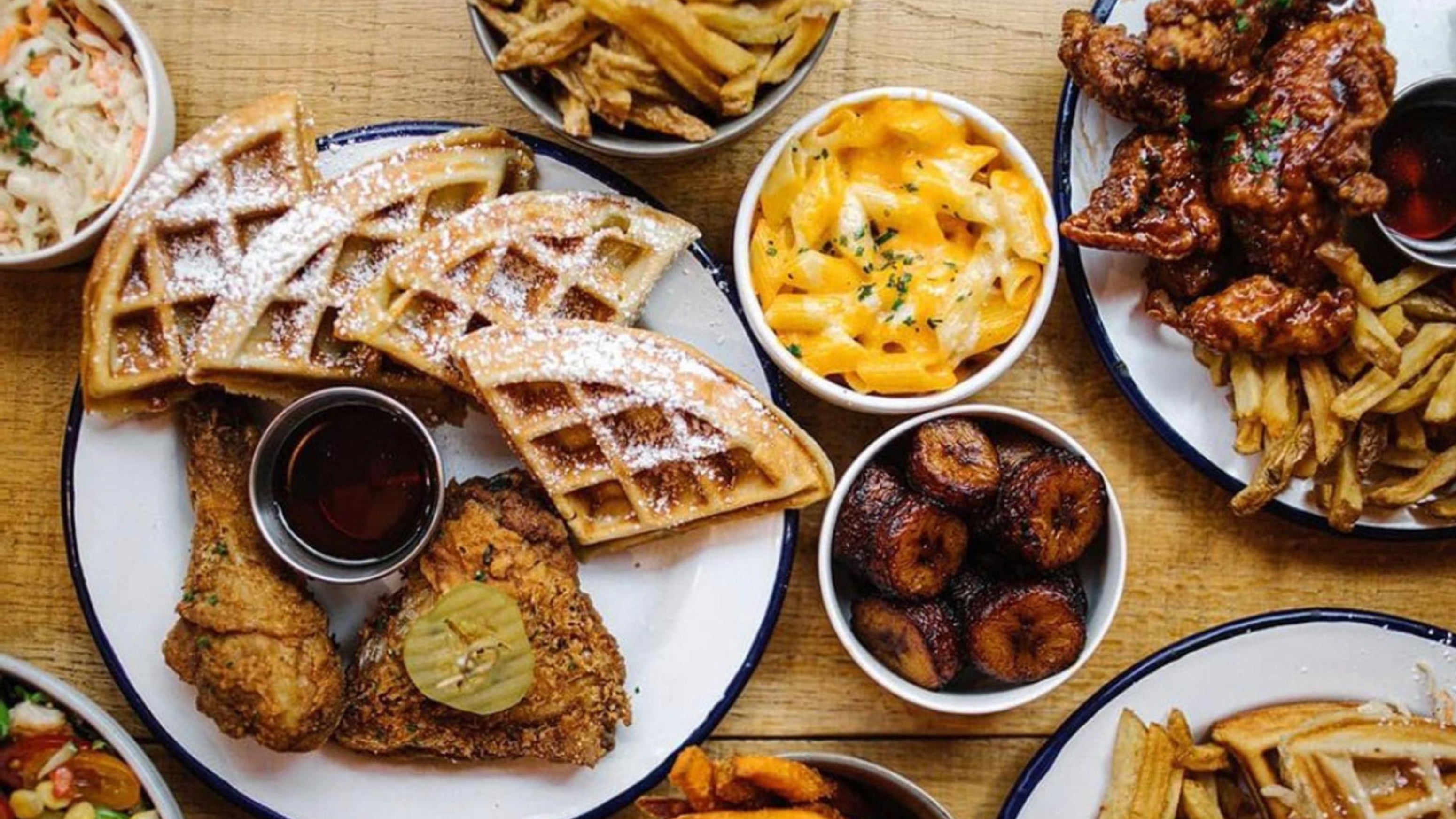 Pièces de poulet marinées et panées accompagnées d'une généreuse gaufre maison et d'une pipette de sirop d'érable.