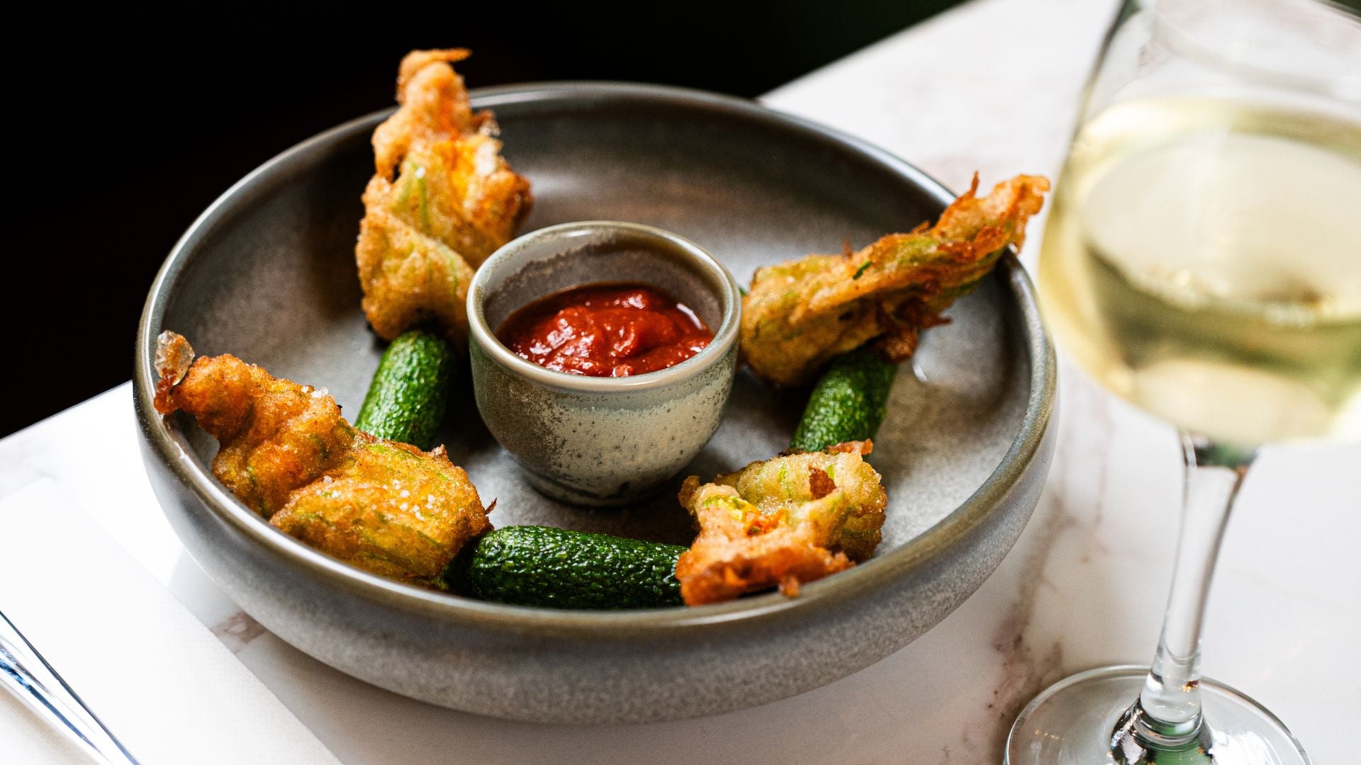 Beignets de fleurs et courgette et coulis de tomate (4 pièces)€24.00Poivrons à l’huile d’olive