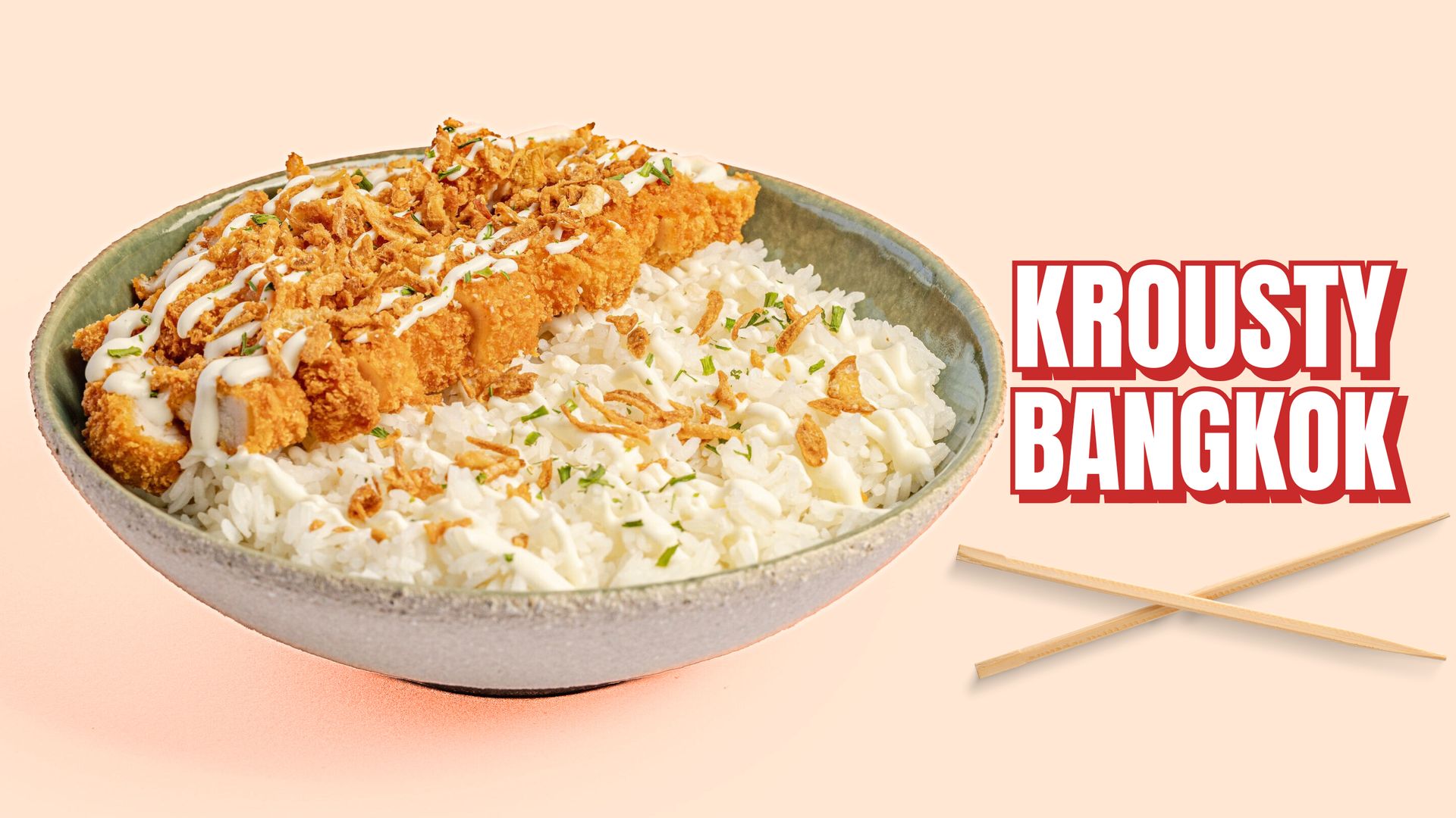Krousty Bangkok : du riz, du poulet croustillant, et une sauce maison qui claque tellement que même les tuk-tuks s’arrêtent pour en parler.