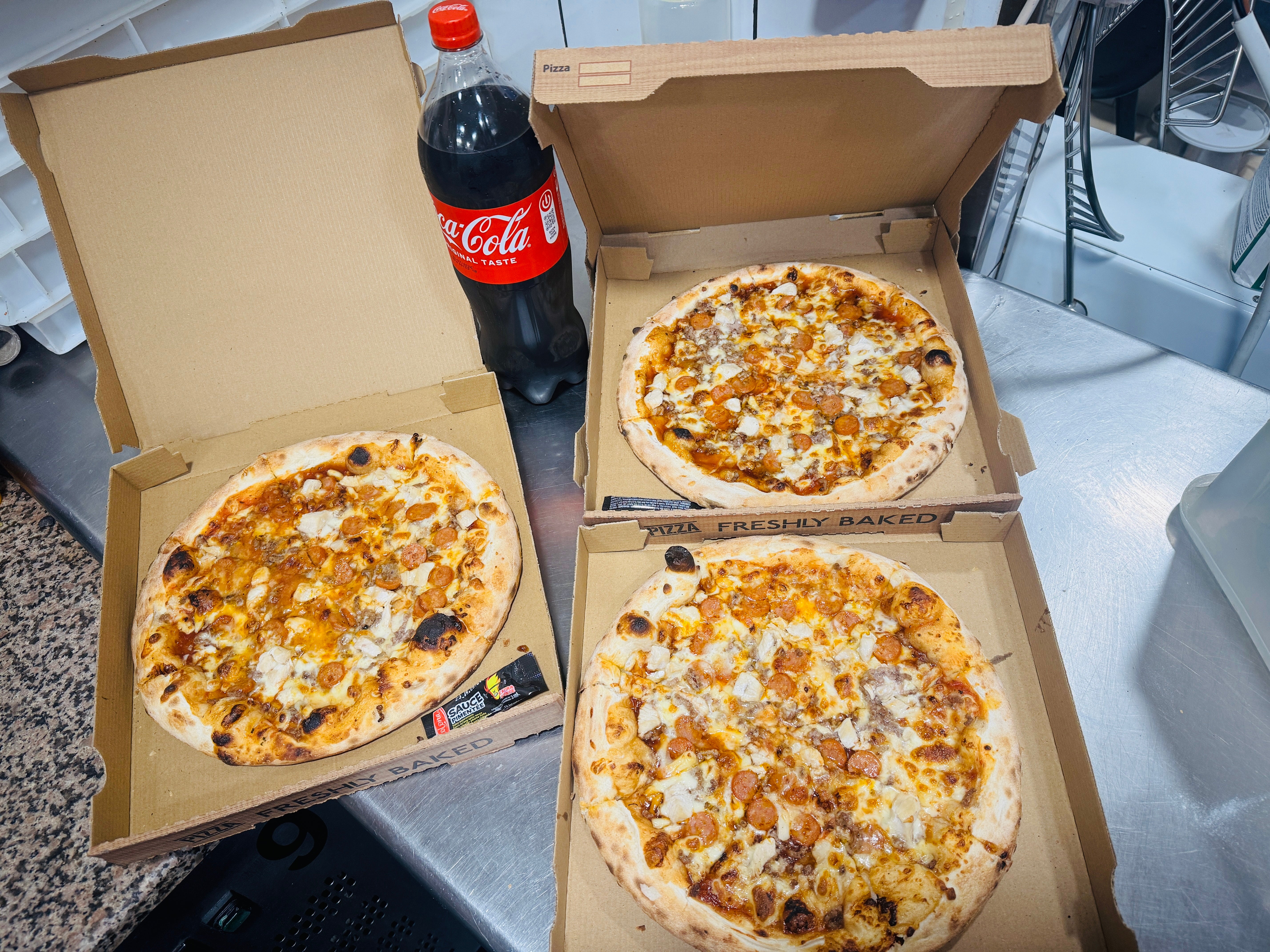 2 Pizzas au choix avec une bouteille.€23.00Menu 3 pizzas