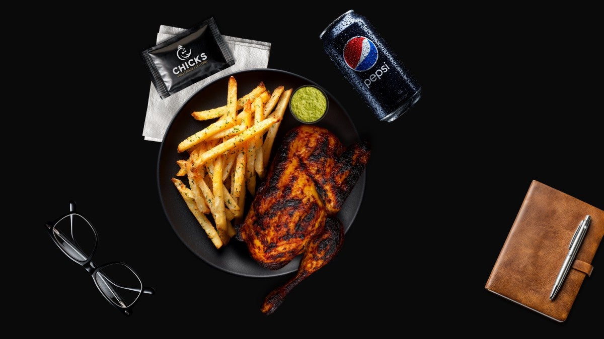 Demi-poulet braisé bien doré et juteux, accompagné de frites maison croustillantes préparées à la minute, servi avec une boisson au choix.