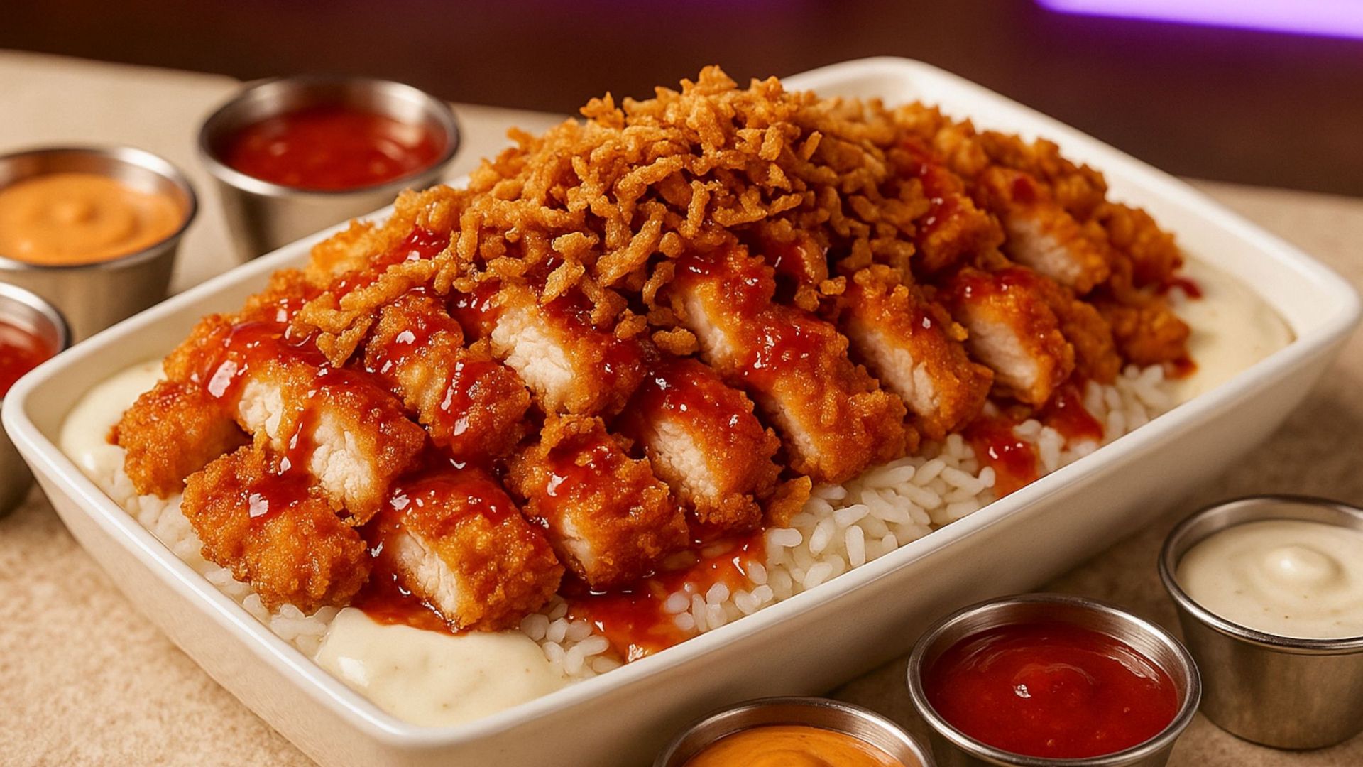 Riz blanc, sauce blanche, oignons frits, tenders panés et sauce au choix.€16.90PopularBuy 1, get 1 free