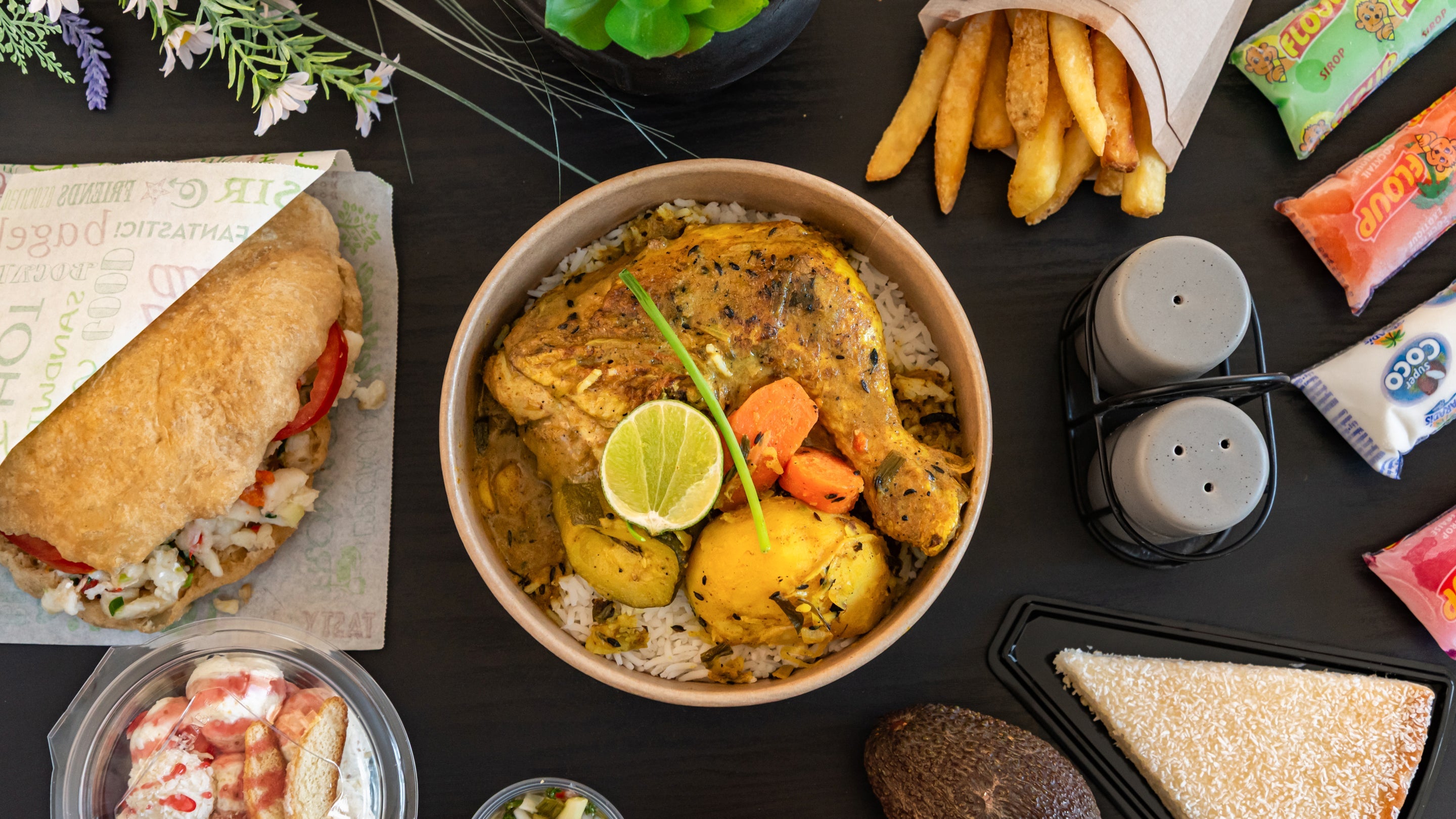 Poulet boucané, salade, tomates, oignons et sauce au choix.€14.00Menu agoulou viande haché bacon de dinde