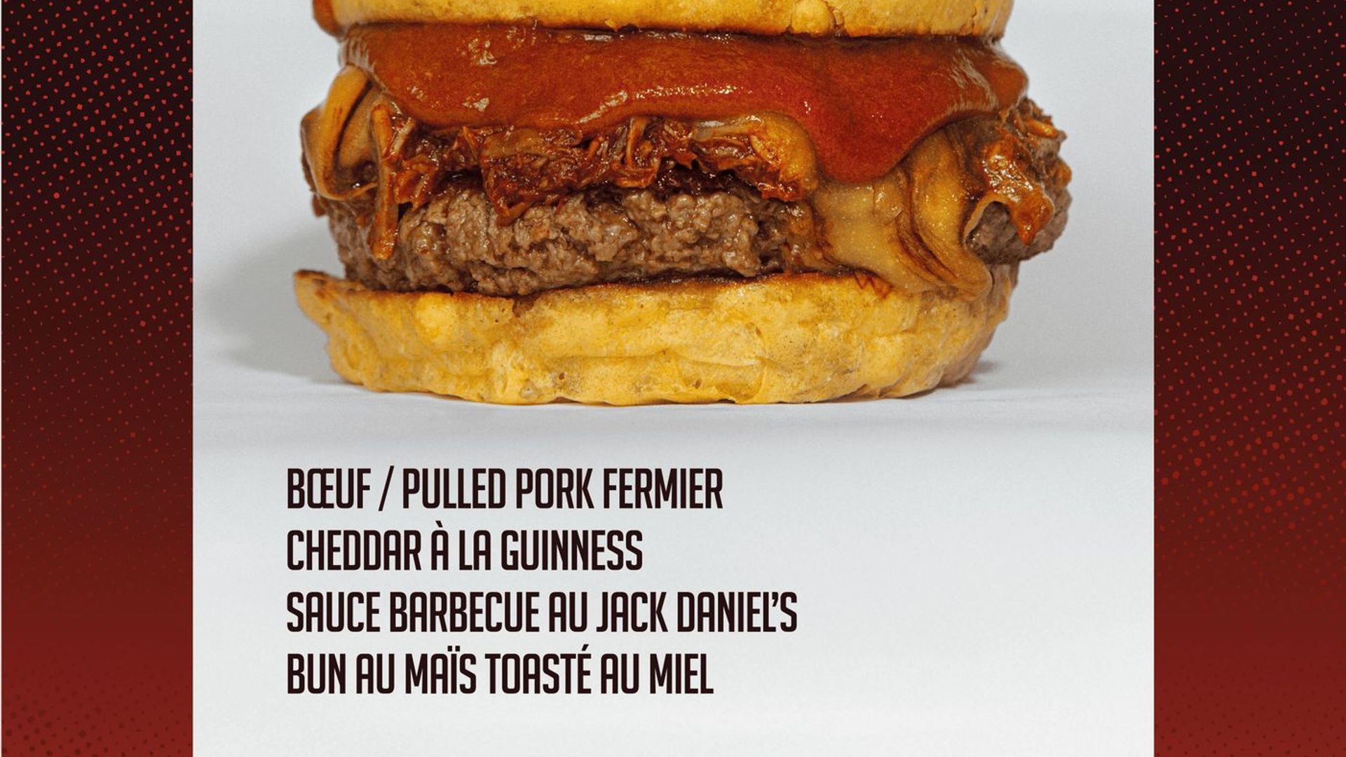 Bun au maïs toasté au miel, steak, pulled pork fermier, cheddar à la Guinness, sauce BBQ au Jack Daniel's€16.90The Challenger