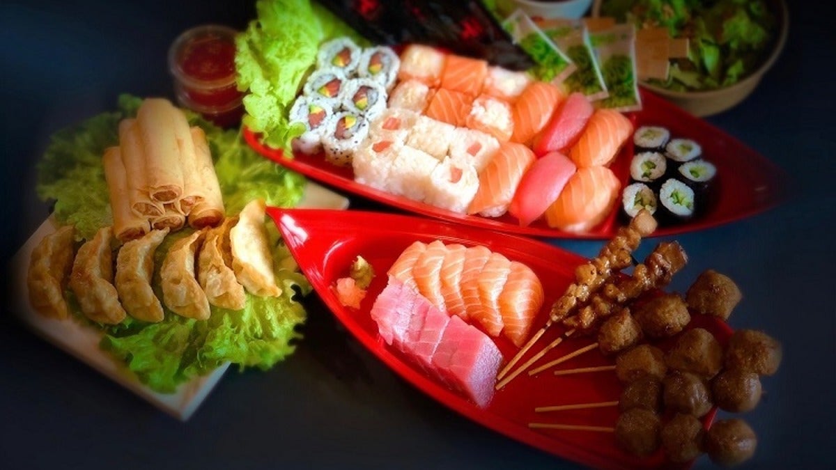 6 Californias saumon avocat, 6 makis concombre, 6 saumons roll cheese, 6 neige rolls cheese, 6 sushis saumon, 12 sashimis saumon, 6 raviolis au poulet, 6 nems aux crevettes, 6 brochettes, 3 salades et 3 soupes€58.50