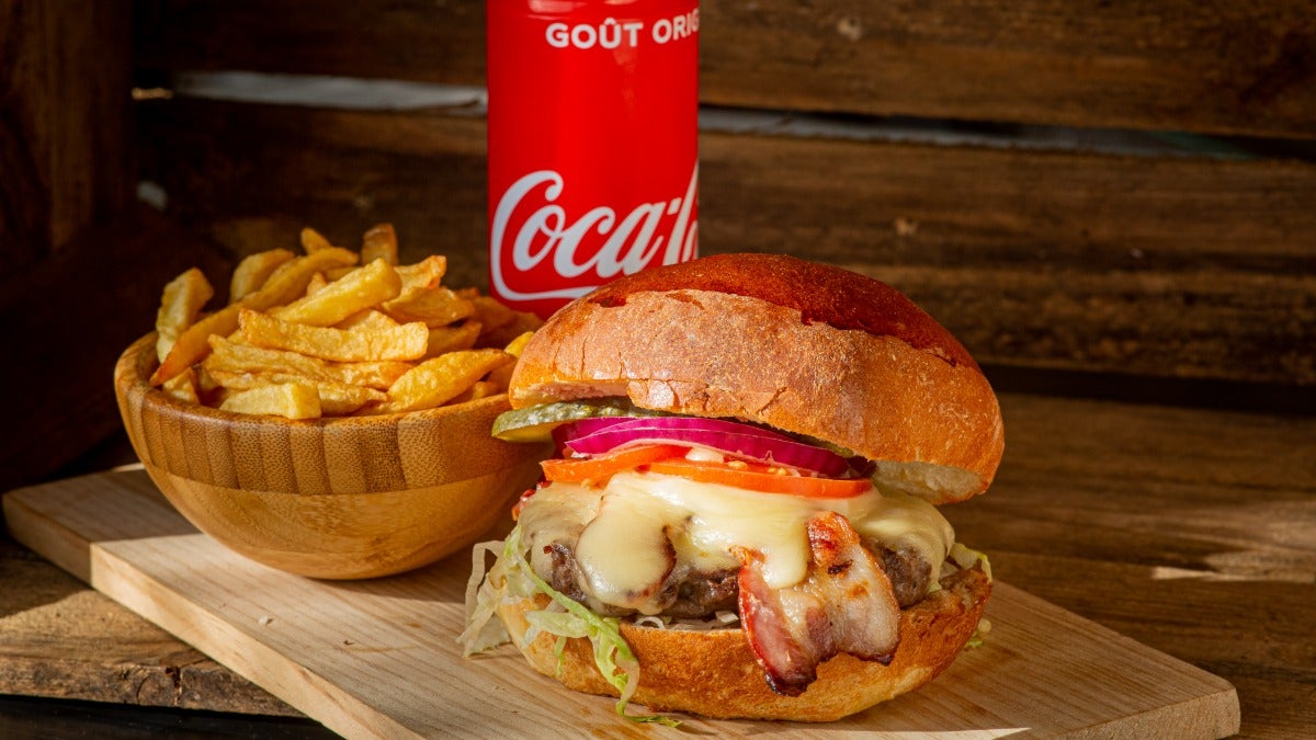 Bun's maison, steak haché frais de Nouvelle Aquitaine, fromage fumé, bacon, salade iceberg, tomates, oignons, cornichons et sauce BBQ€14.85Aurillac