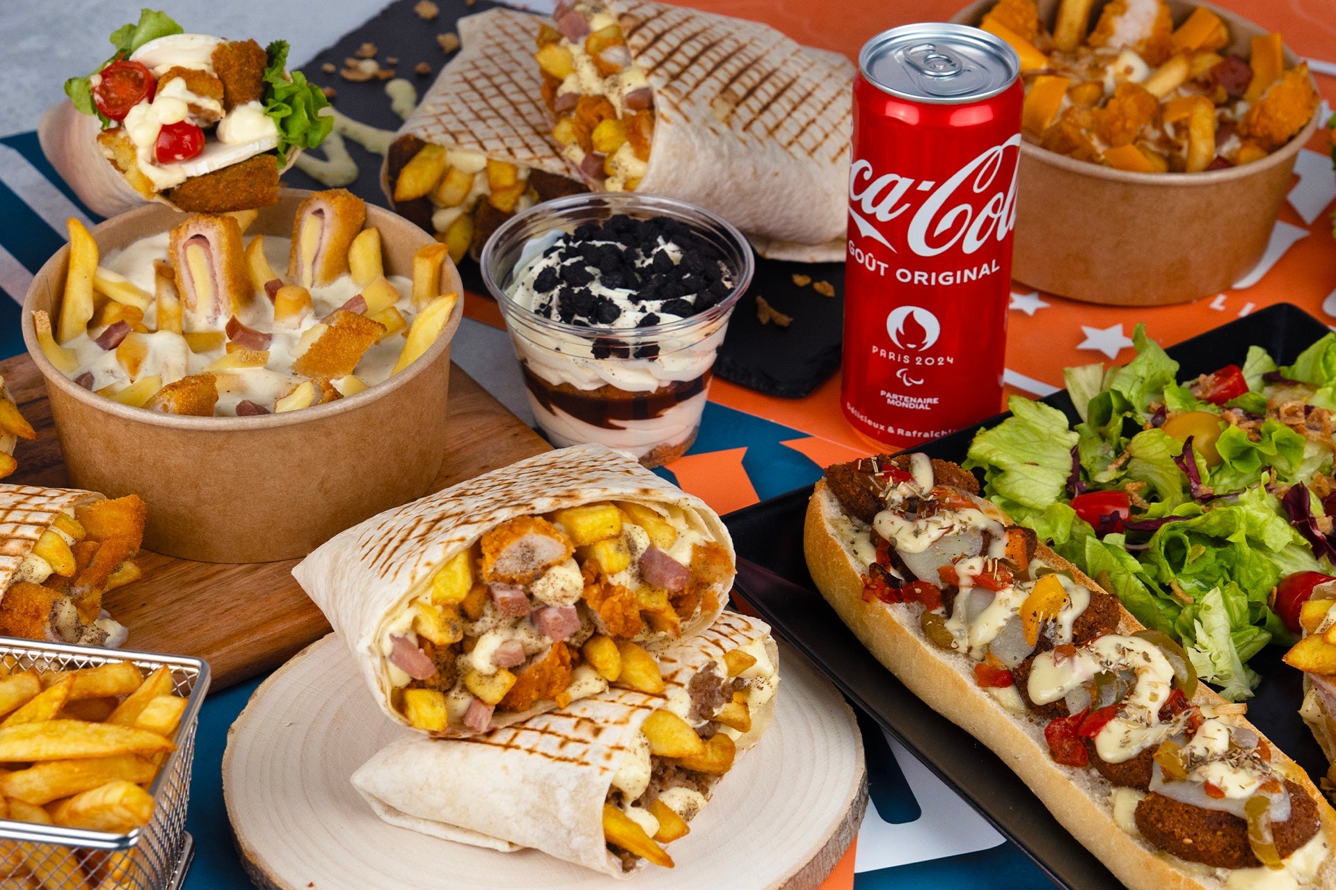 Une généreuse baguette 🥖, lamelles de kebab fraîchement tranchées, salade batavia 🥗, de délicieuses tomates cerises 🍅, oignons rouges 🧅, fromage fêta 🧀 avec ta sauce préférée de ton choix ! 😋 Servi avec frites et boisson 33cl€13.90