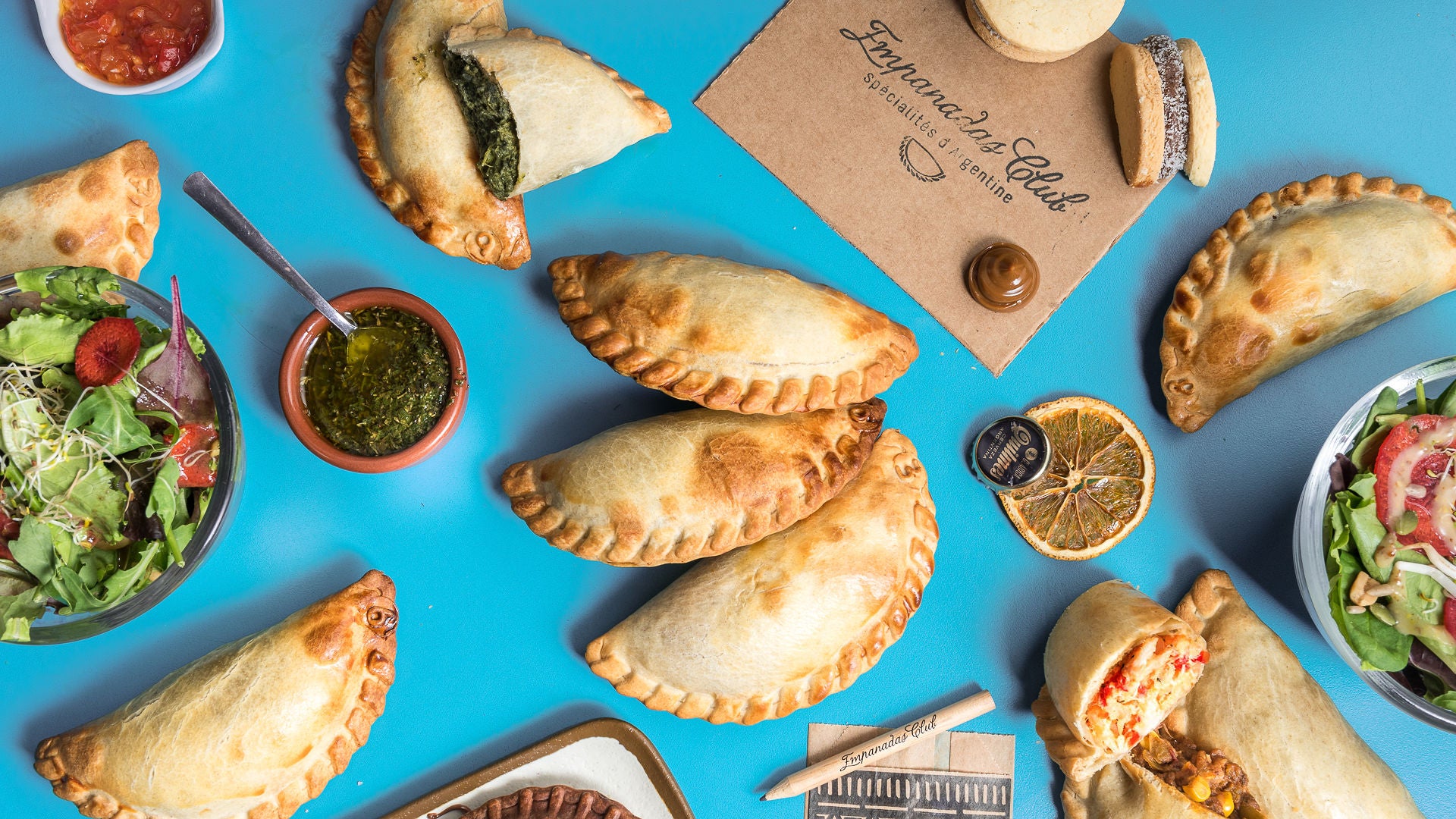 Highly rated· 6 empanadas au choix, deux salades et deux desserts au choix: Copetin (dessert chocolat / banane) ou Alfajor (sablé dulce de leche)€38.50