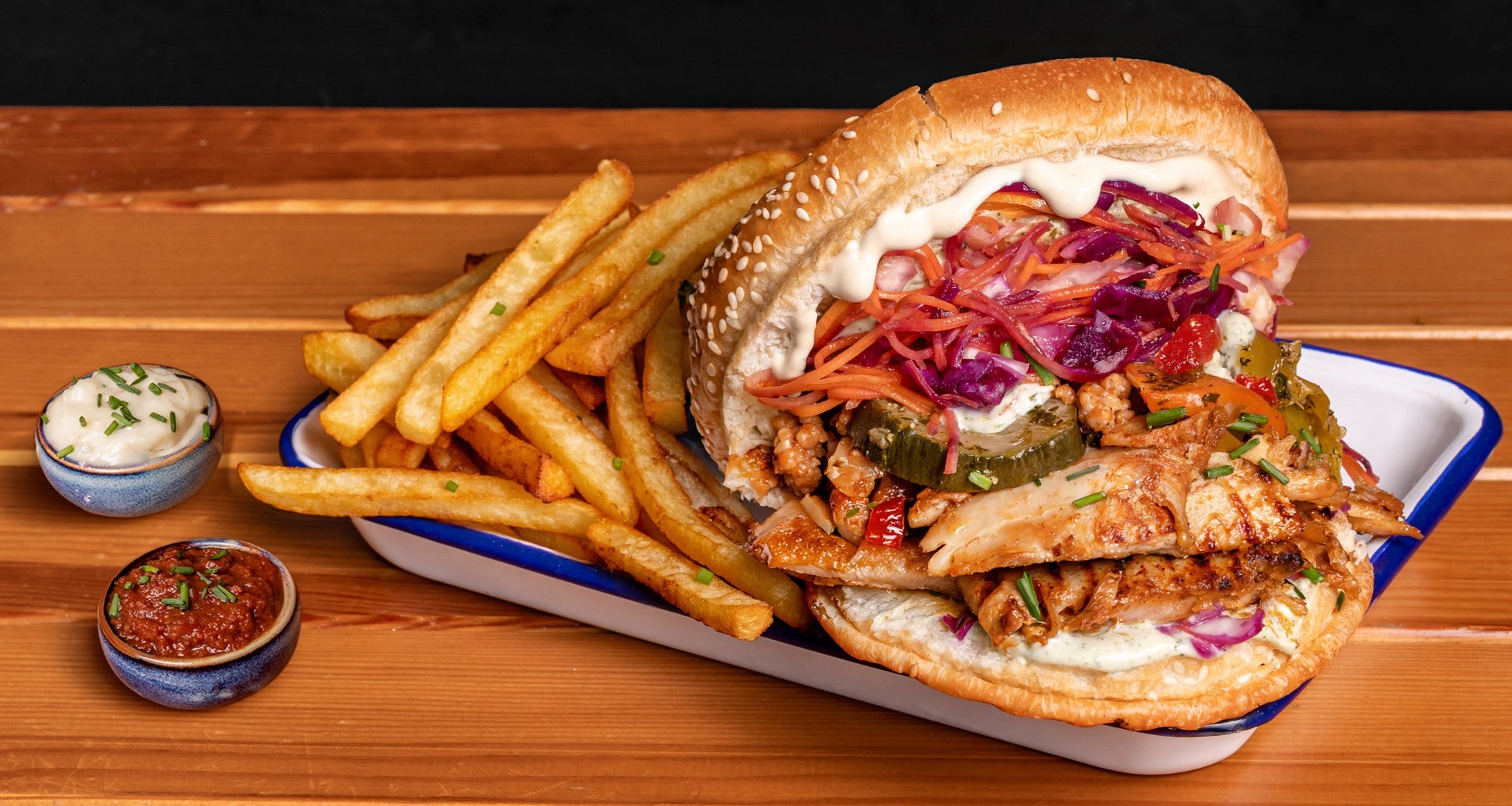 Dans un pain bun’s aux sésames de la boulangerie PozzoliPoulet mariné maison puis confit sur broche, Légumes marinés chauds (poivron rouge, carotte, courgette), légumes frais (chou rouge, carotte, chou blanc) et une sauce maison au choix.€14.90Original végé