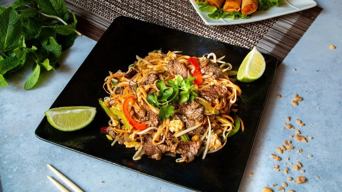 Pates de riz sauté ensemble avec des légumes, boeuf, cacahuètes, oignons frits4.6(20)€18.90