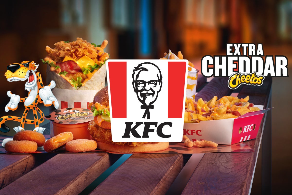 Le nouveau burger cheddar supplĂ©ment cheddar de KFC, version veggie !âBurger composĂ© d'un panĂ© veggie, un panĂ© de cheddar, de vĂ©ritables Crunchy CheetosÂź*, une sauce creamy cheddar (sauce crĂ©meuse au cheddar), un pickle de cornichons pour le peps et de la salade, le tout dans un nouveau bun au cheddar gratinĂ© ! ââ+ 1 accompagnement + 1 boissonâ*SoufflĂ©s au maĂŻsâŹ14.95MENU EXTRA CHEDDAR & BACON BOXMASTER