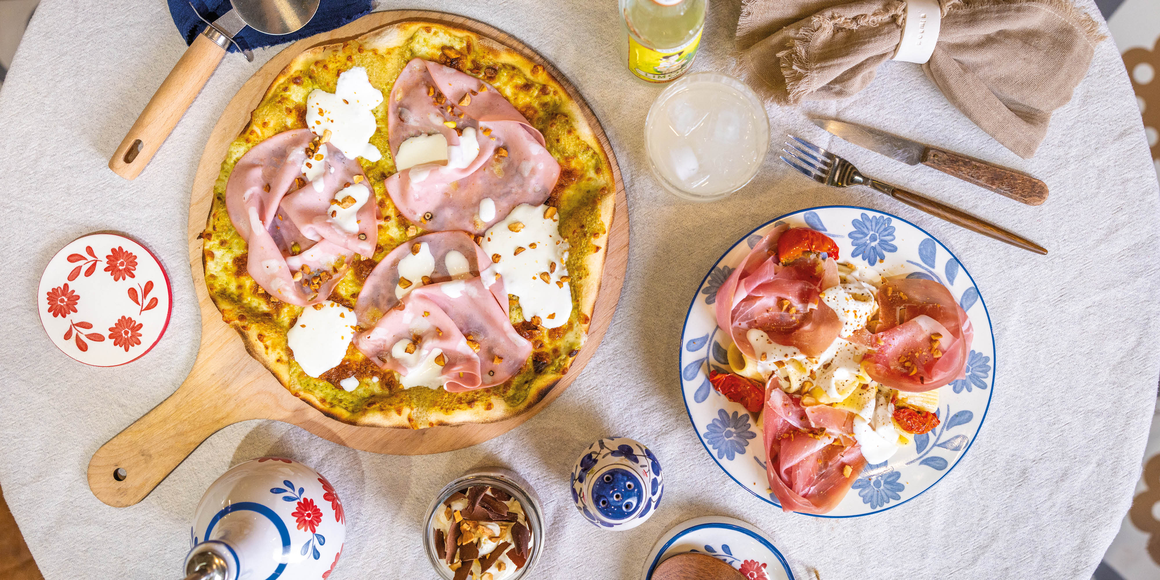 Crème Signorizza Genovese, mozzarella. Après cuisson : Mortadelle de Bologne, fromage frais stracciatella, amandes concassées, basilic frais.€19.00Pataccia