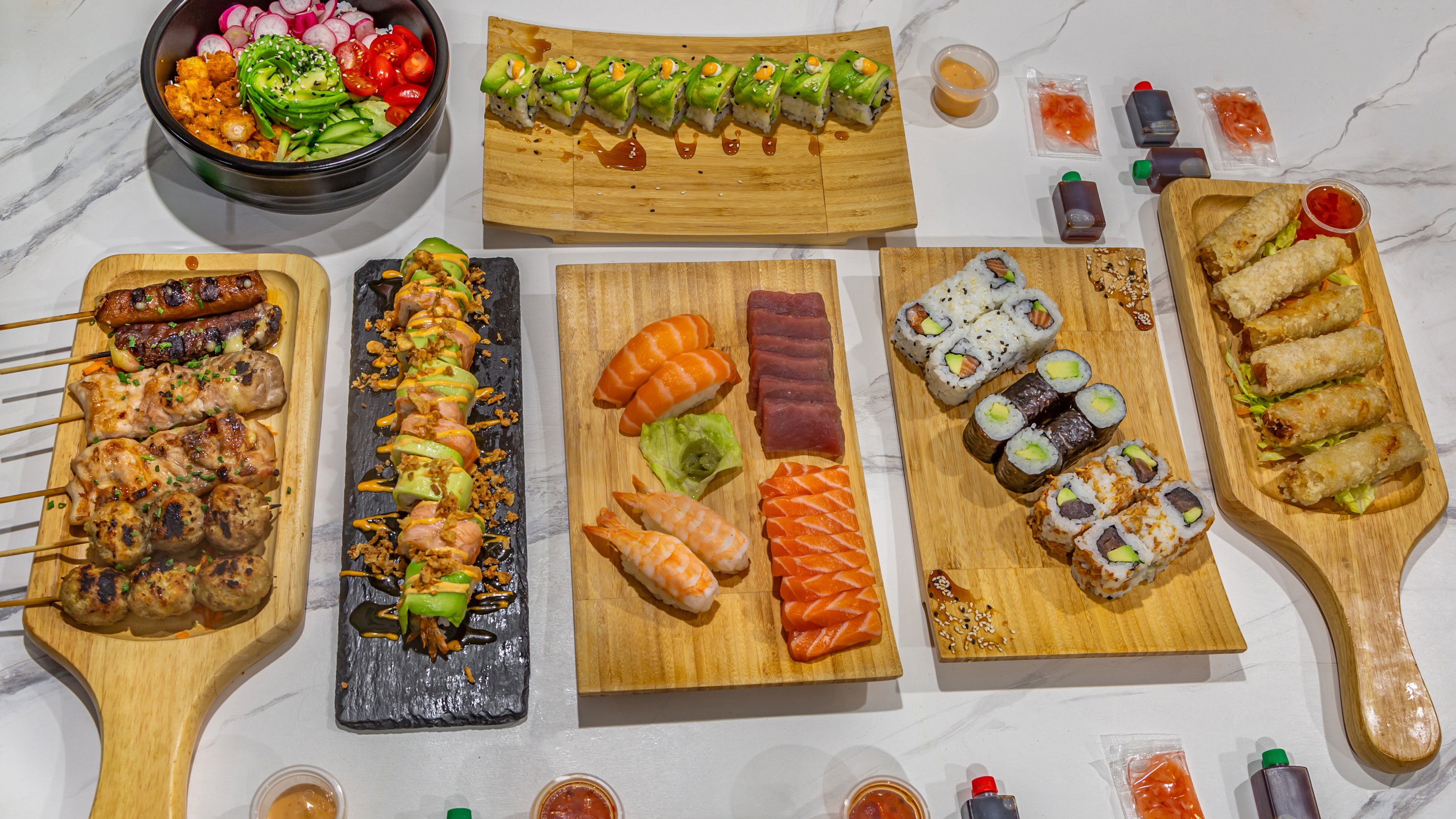 x6 Makis saumon, x4 sushis saumon, x3 sashimis saumon, x3 sashimis thon, x1 brochette de bœuf, x1 brochette de poulet et x1 brochette de bœuf fromage.