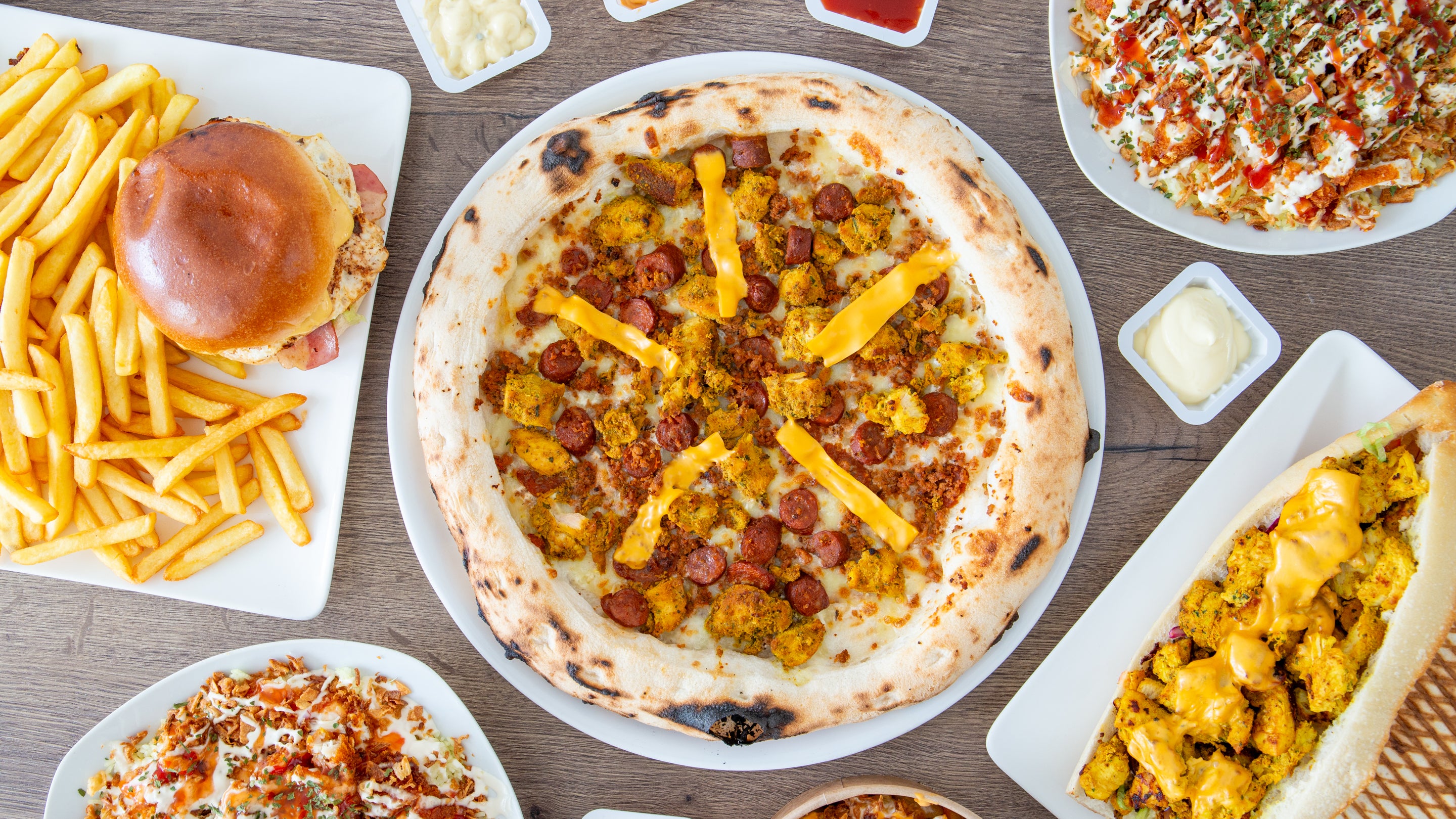Crème, mozzarella, poulet, merguez, viande hachée, pdt, cheddar
