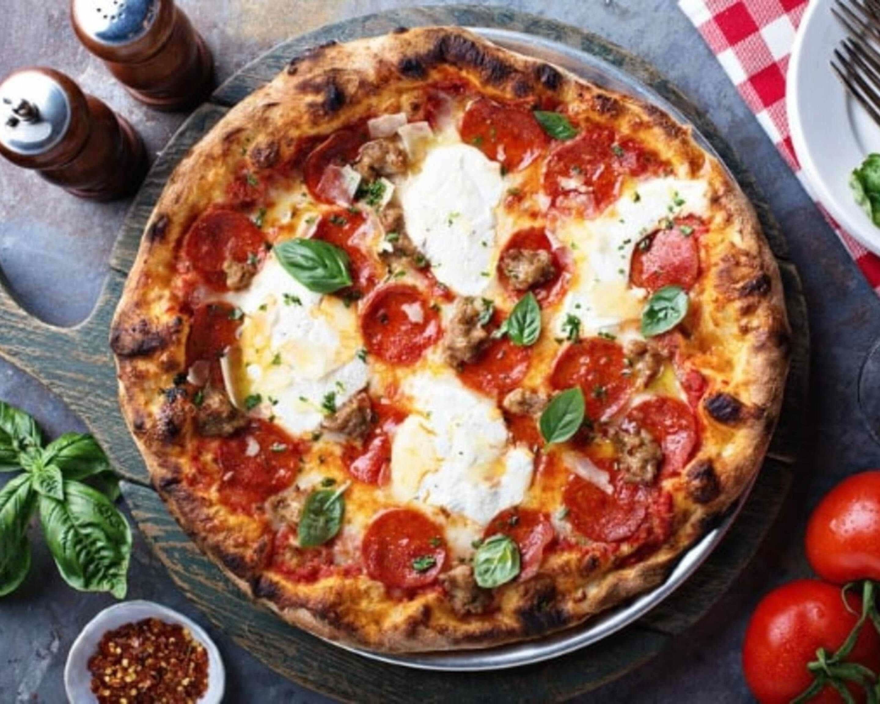 Base sauce tomate, viande kebab, oignons, tomates, sauce samourai et fior di latte.12,90 €