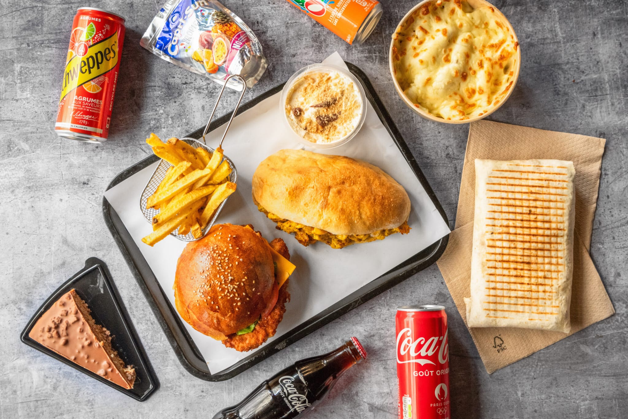 Double steak, escalope de poulet panée, salades, tomates, oignons rouges, cheddar et sauce burger maison.17,50 €Le filou (menu enfant)