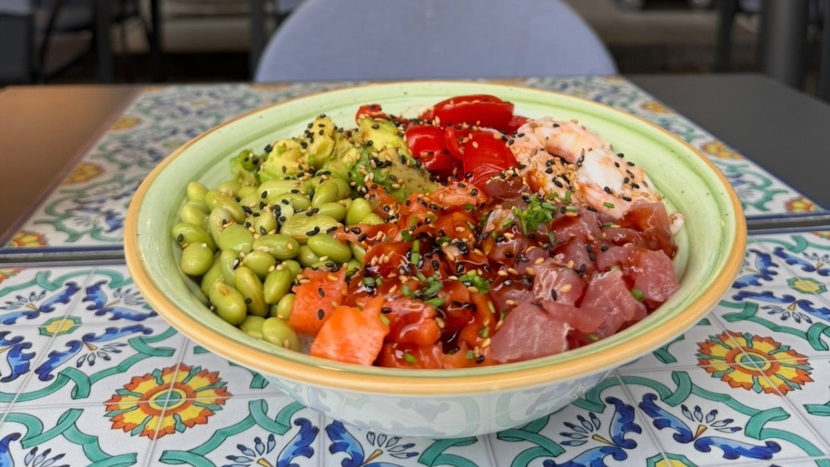 Riso bianco, goma wakame, avocado, datterino giallo, cavolo rosso, sesamo e soya16,00 €Gamberi, tonno e salmone marinato