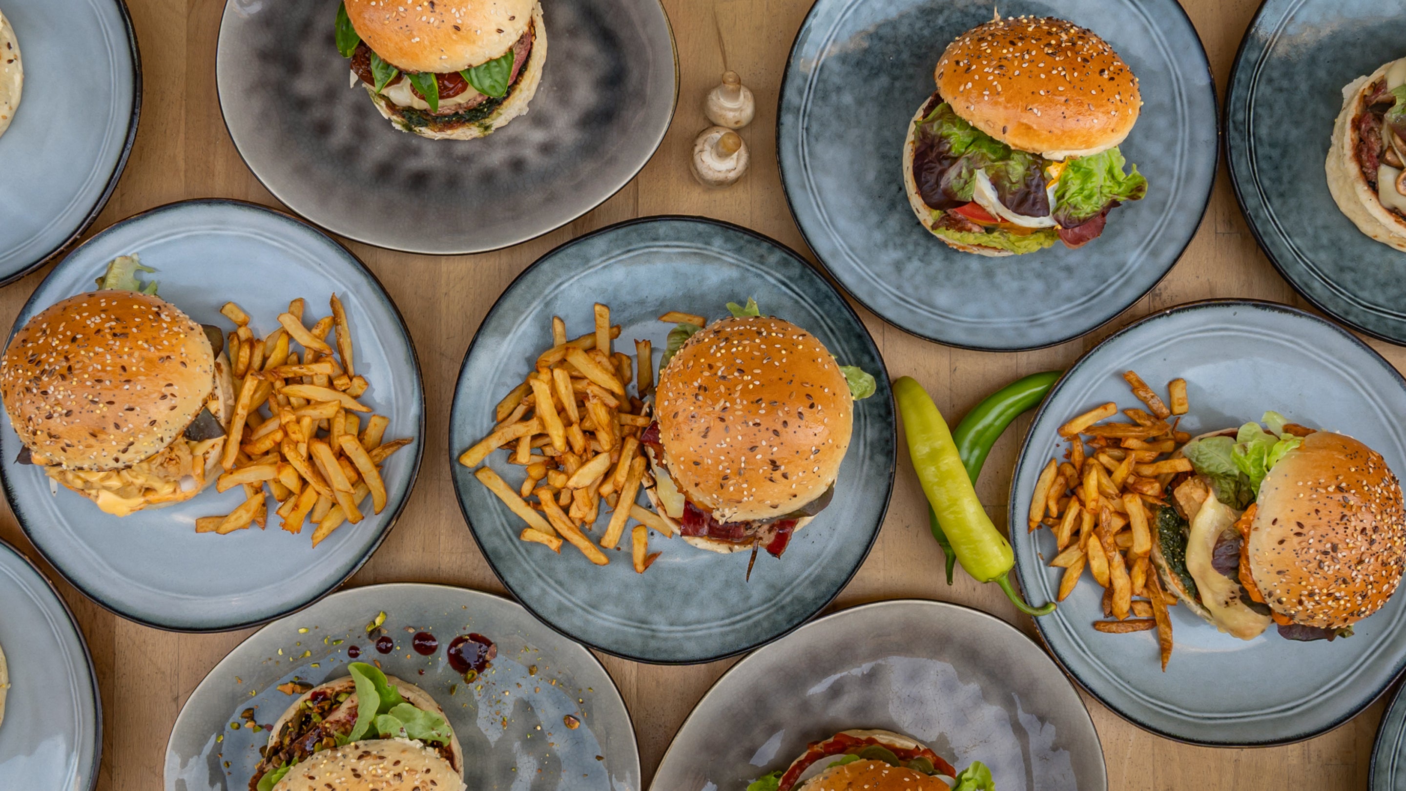 Salade, Aubergines grillées, steak végétal, tomates, cheddar affiné, oignons, poivrons, servis avec des frites maison