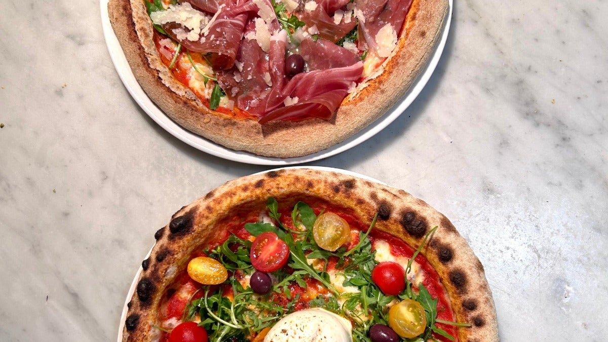 Sauce tomate San Marzano AOP, Mozzarella Fior di Latte, Parmigiano,Reggiano AOP, Jambon de Parme affiné de 12 à 16 mois, Roquette,Olives Riviera, Huile d’olive extra vierge