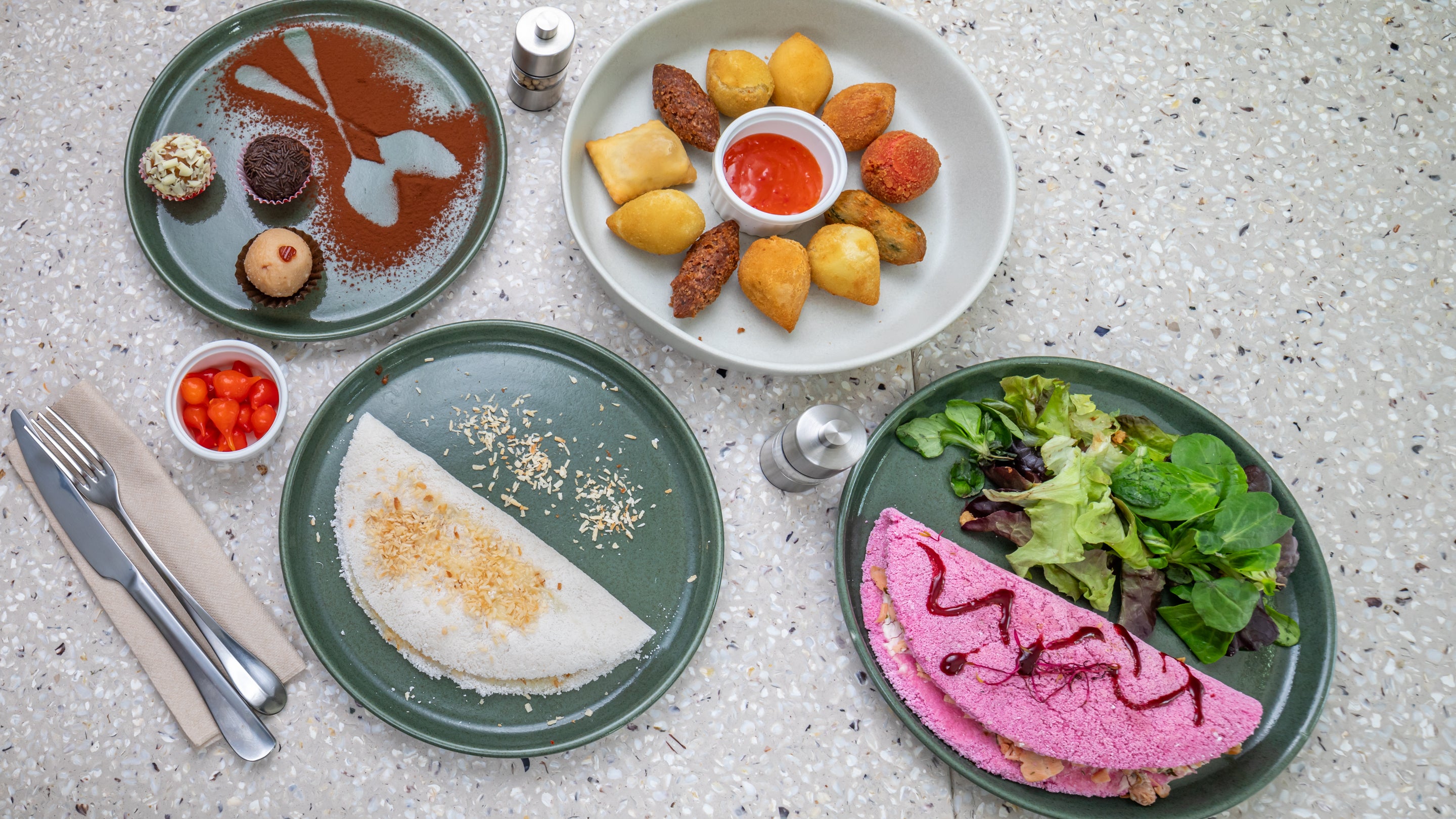 Croquette au poulet effiloché et sauce chimichurri ou sauce ketchup à la goyave. ( 5 unités)10,00 €Assortiment de streetfood brésilien à partager