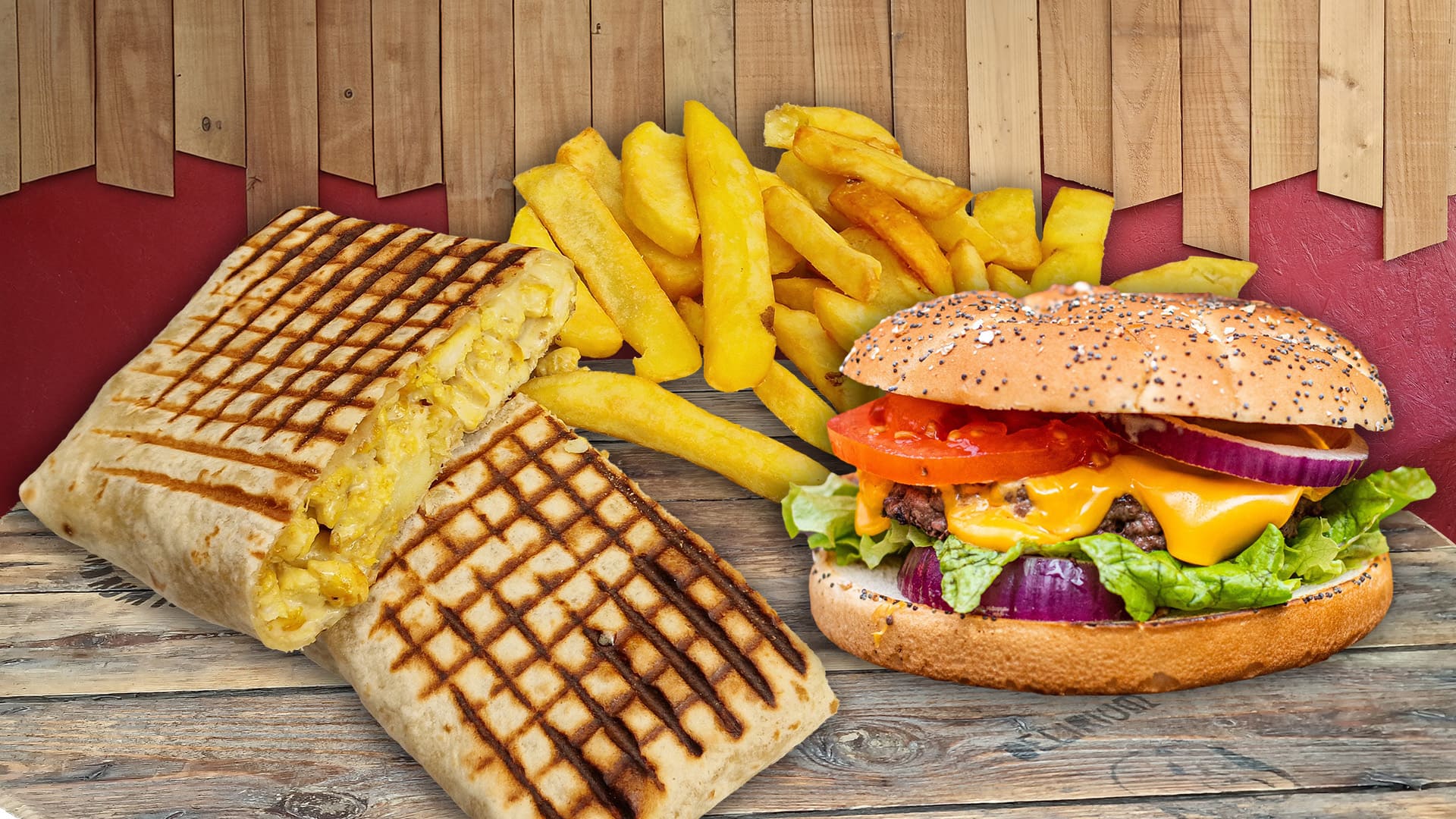 Galette de Légume, Cheddar, Salade, Tomate, Oignons, Huile d'olive.Servi avec Frites Steakhouse et Boisson 33cl.