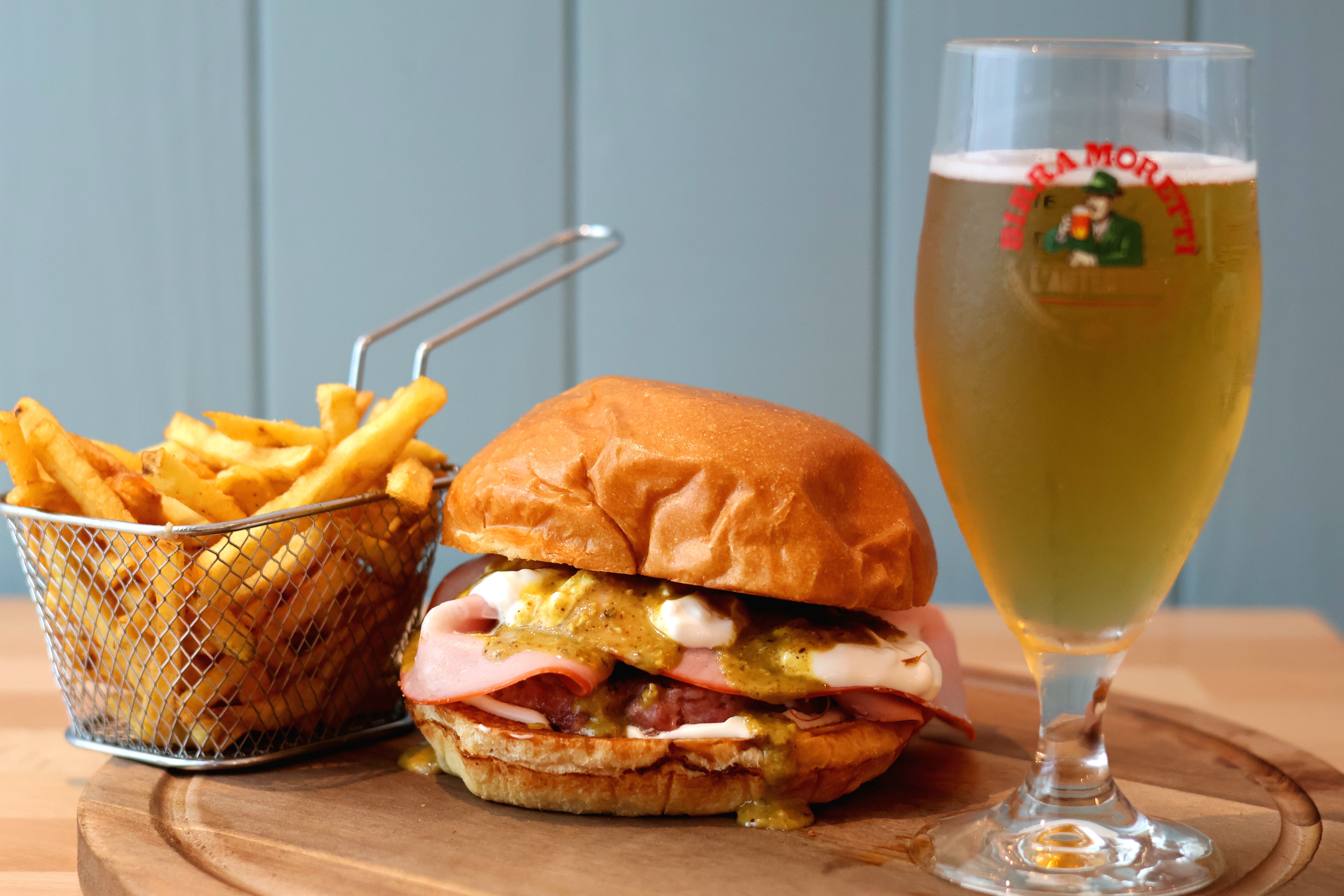 Steak de bœuf de 170gr., emmental affiné, laitue, tomate fraîche15,00 €Porkettone