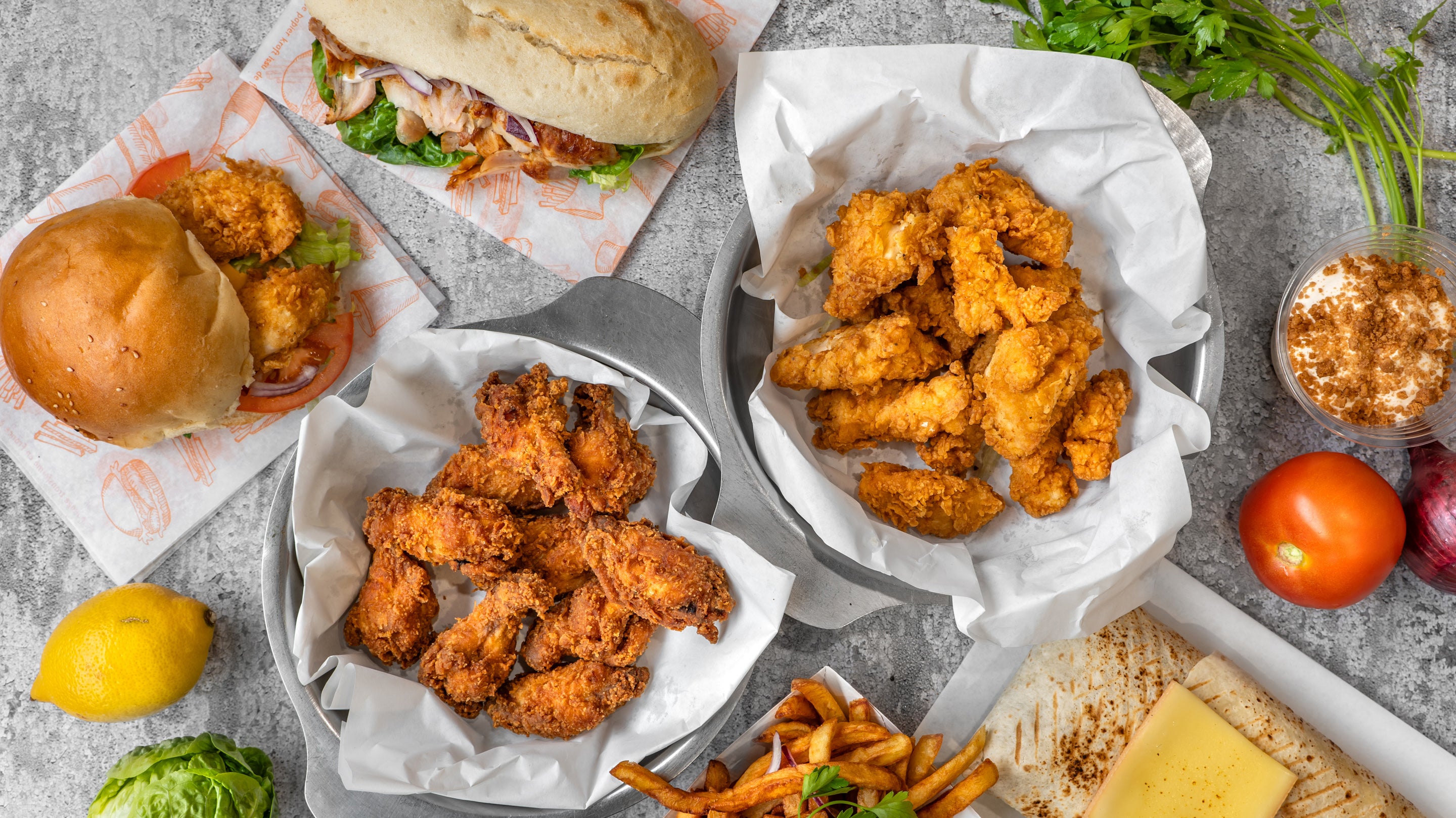 Nombre de pièces au choix. (Ailes et pilons) marinés et cuisinés d'après la recette originale o délices (épicé).5,50 €Tenders fait maison
