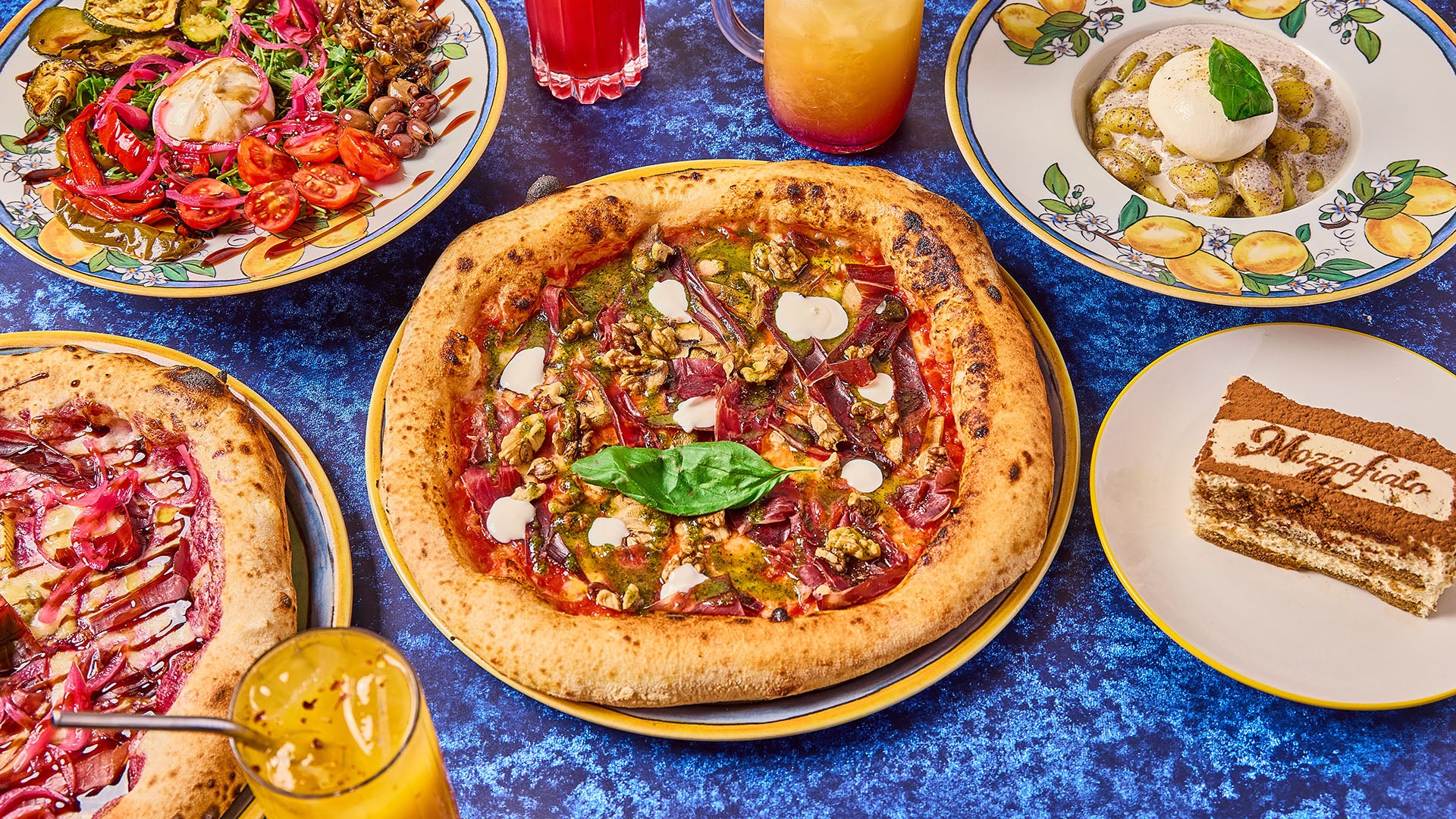 Sauce tomate, Fior di latte, Spianata, gorgonzola, Pickles d’oignons,ricotta