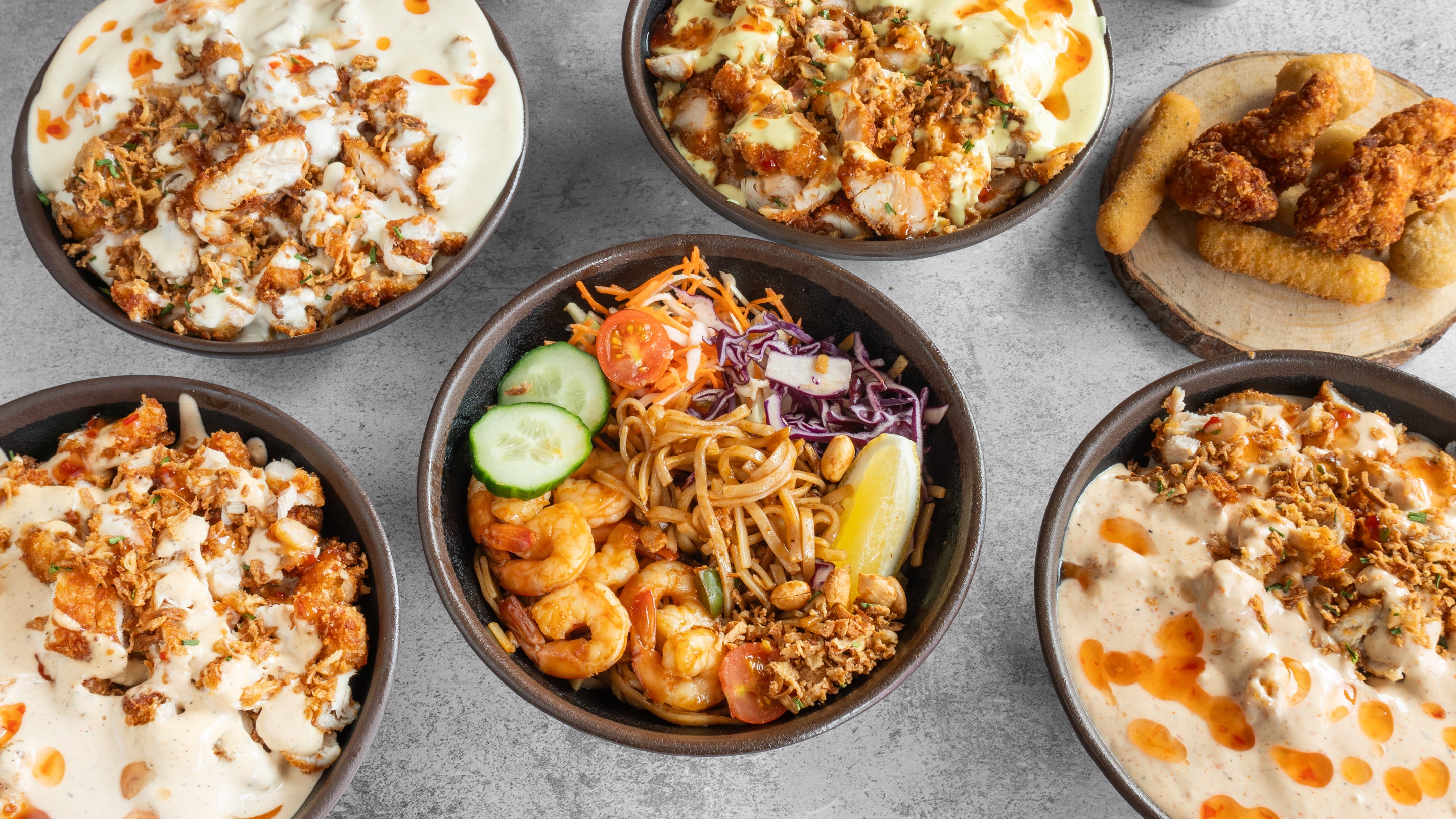 Riz blanc parfumé, Poulet Croustillant maison, herbes thaï parfumées, oignons frits, sauce MANGO maison et sauce thaï maison.9,90 €