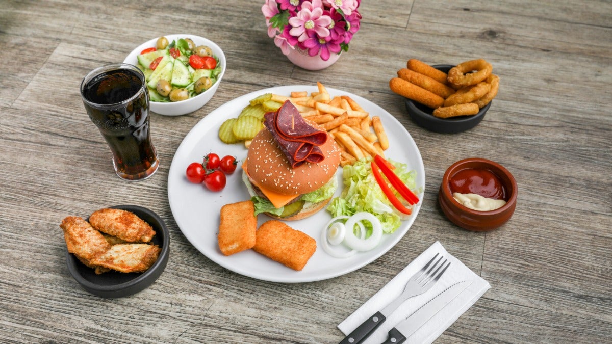 Baobun moelleux, 2 steaks smashés, salade, oignons rouges, sauce maison. Servi avec frites.