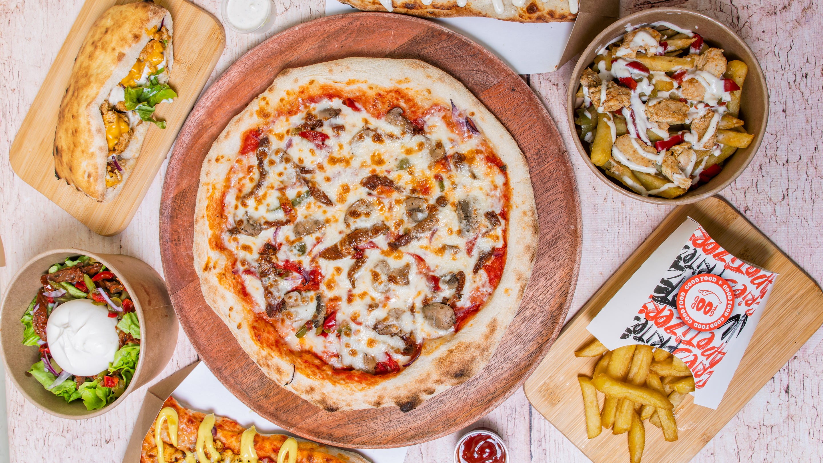 Sauce tomate, mozzarella, poivrons grillés, viande hachée, merguez.