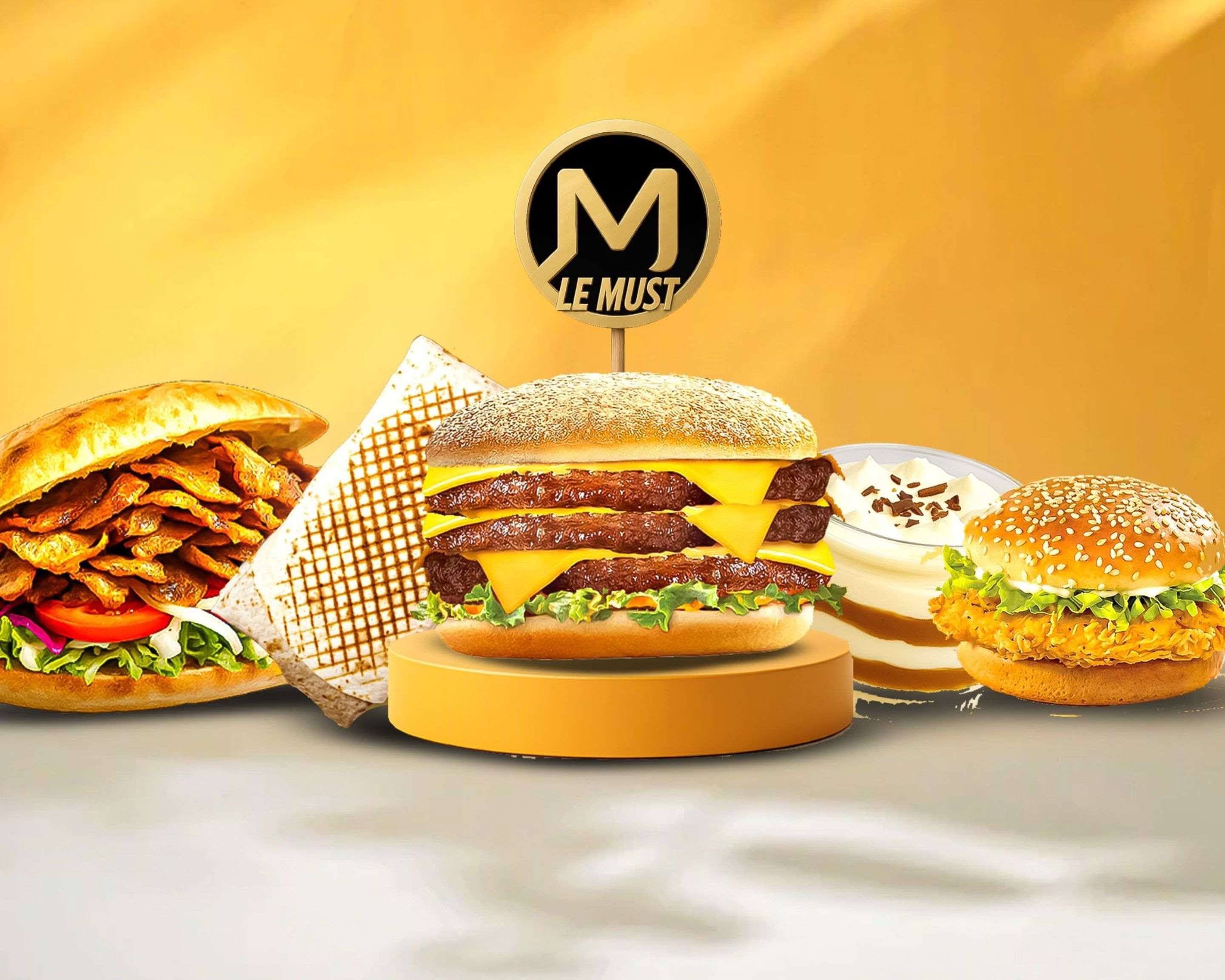 Steak de 180g, fromage fondant, épais et juteux et une explosion de saveurs !.9,50 €🍔 Triple Méga – C'est un Burger ou une Barricade ?