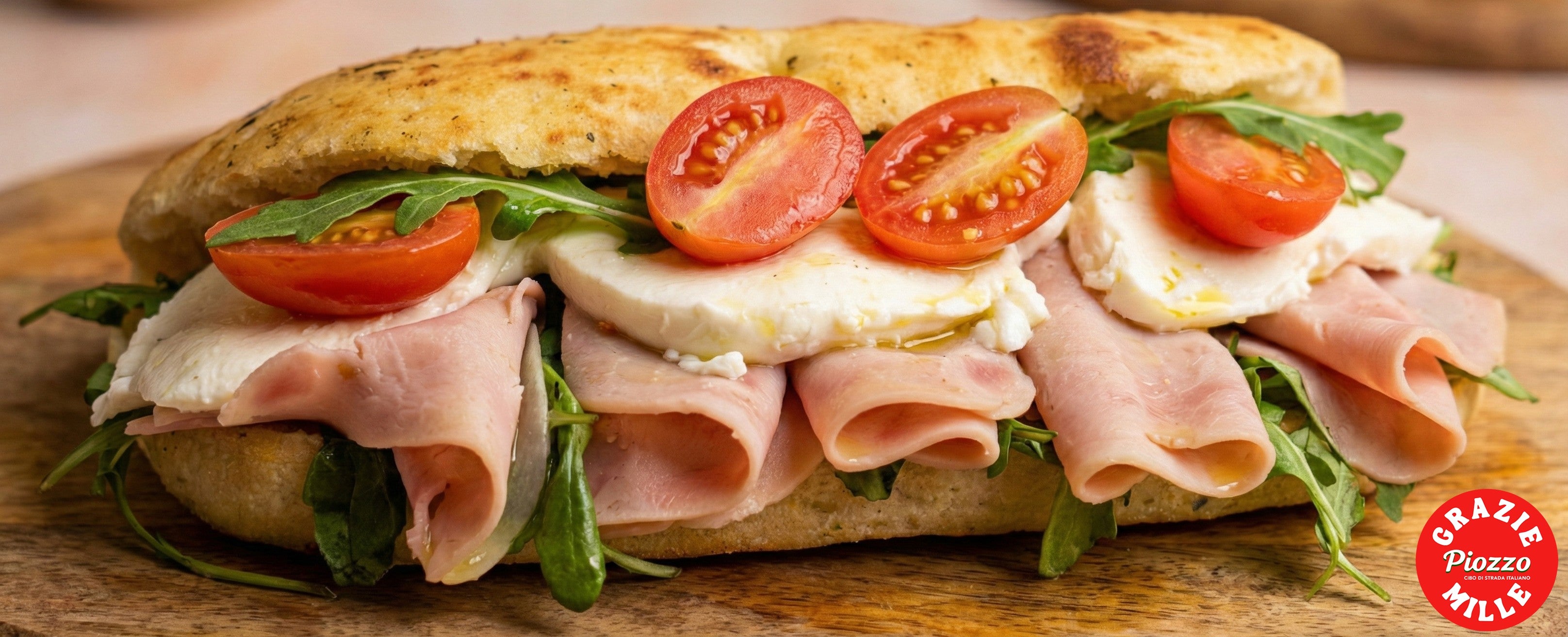 🥖 Panuozzo italien cuit au fourMozzarella fraiche, jambon de dinde, tomates fraîches, roquette et filet d’huile d’olive.Un classique gourmand, idéal pour une première découverte de Piozzo.13,50 €🥖Di Parma