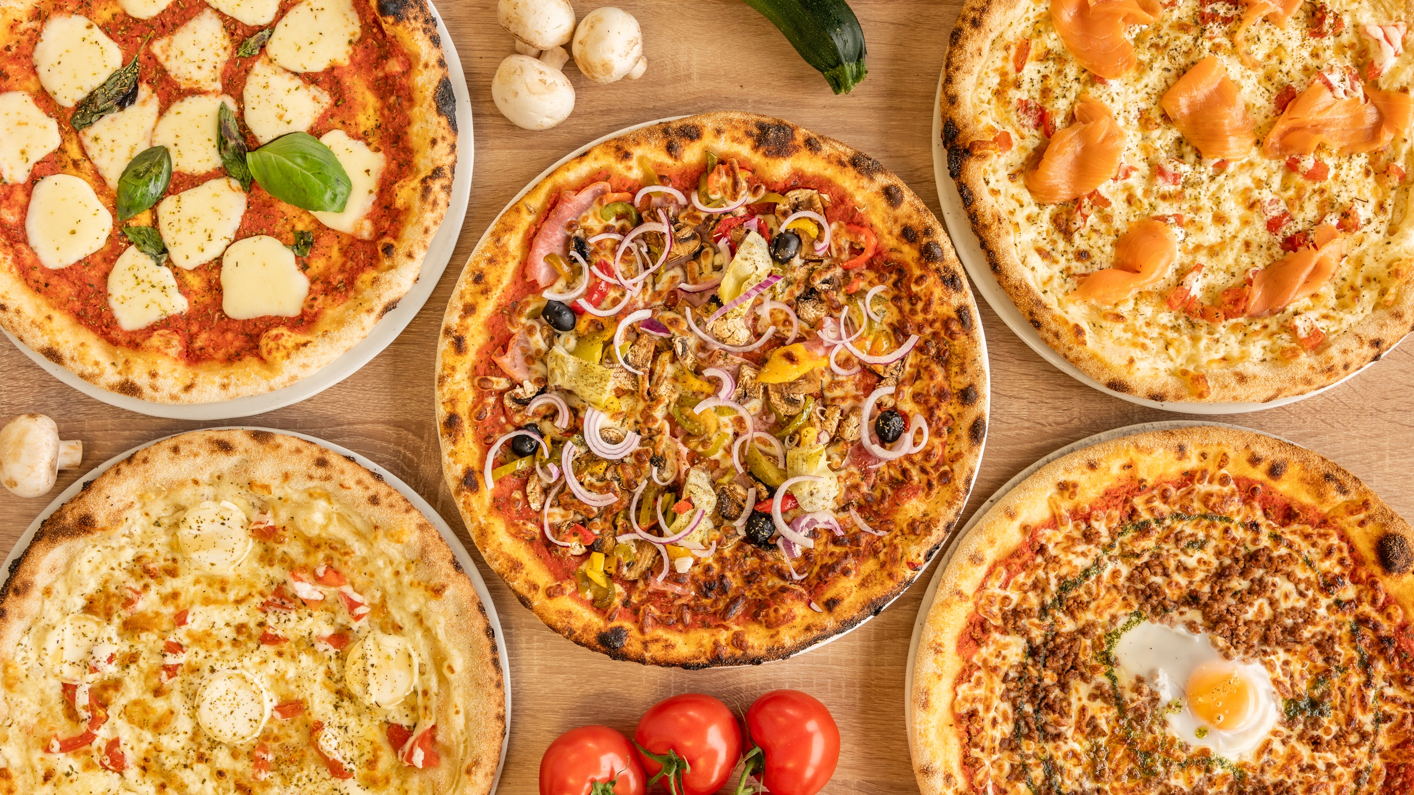Toutes les pizzas sont garnies de mozzarella, olives et origan.