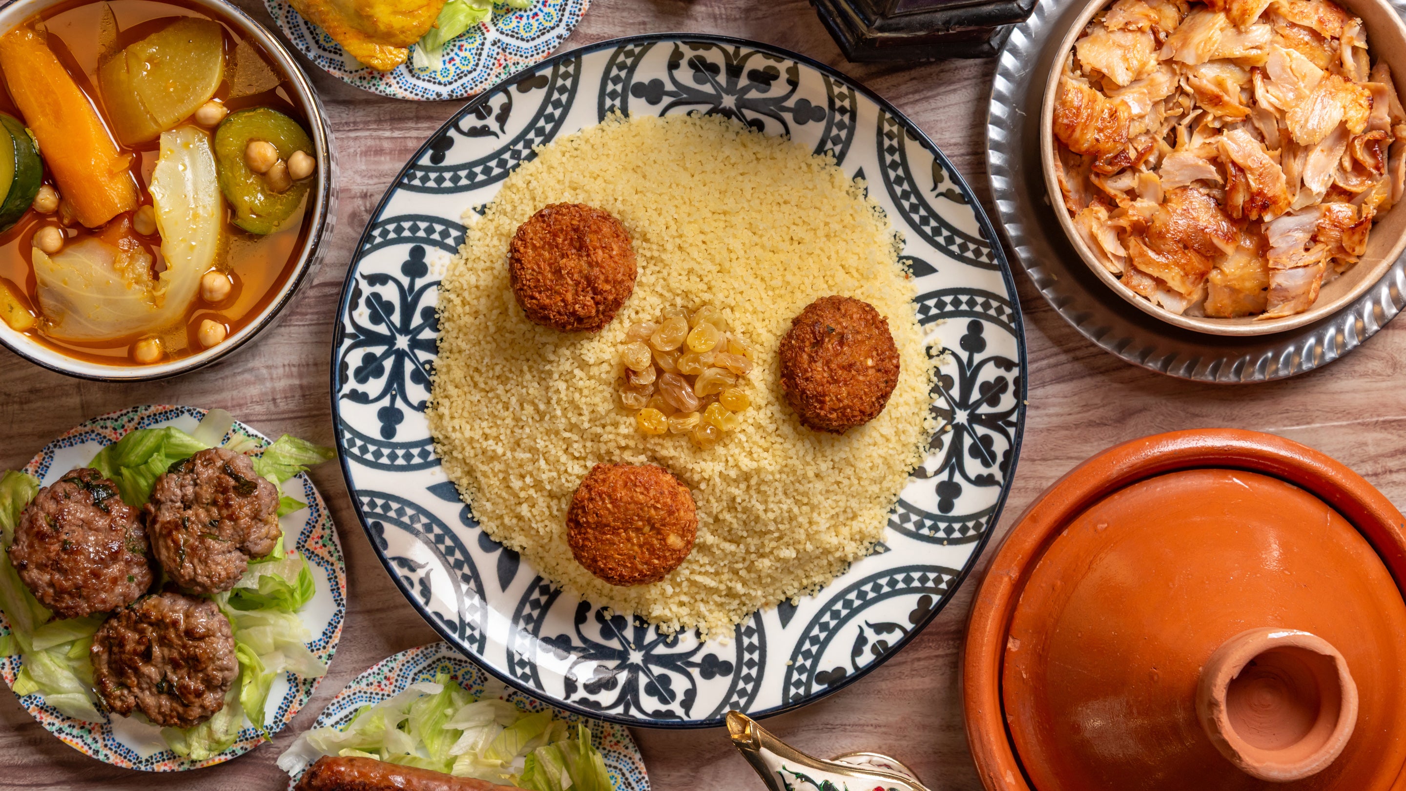 Semoule, courgettes, carottes, navets, chou, raisin, pois chiches16,50 âŹVĂ©gĂ©tarienKefta