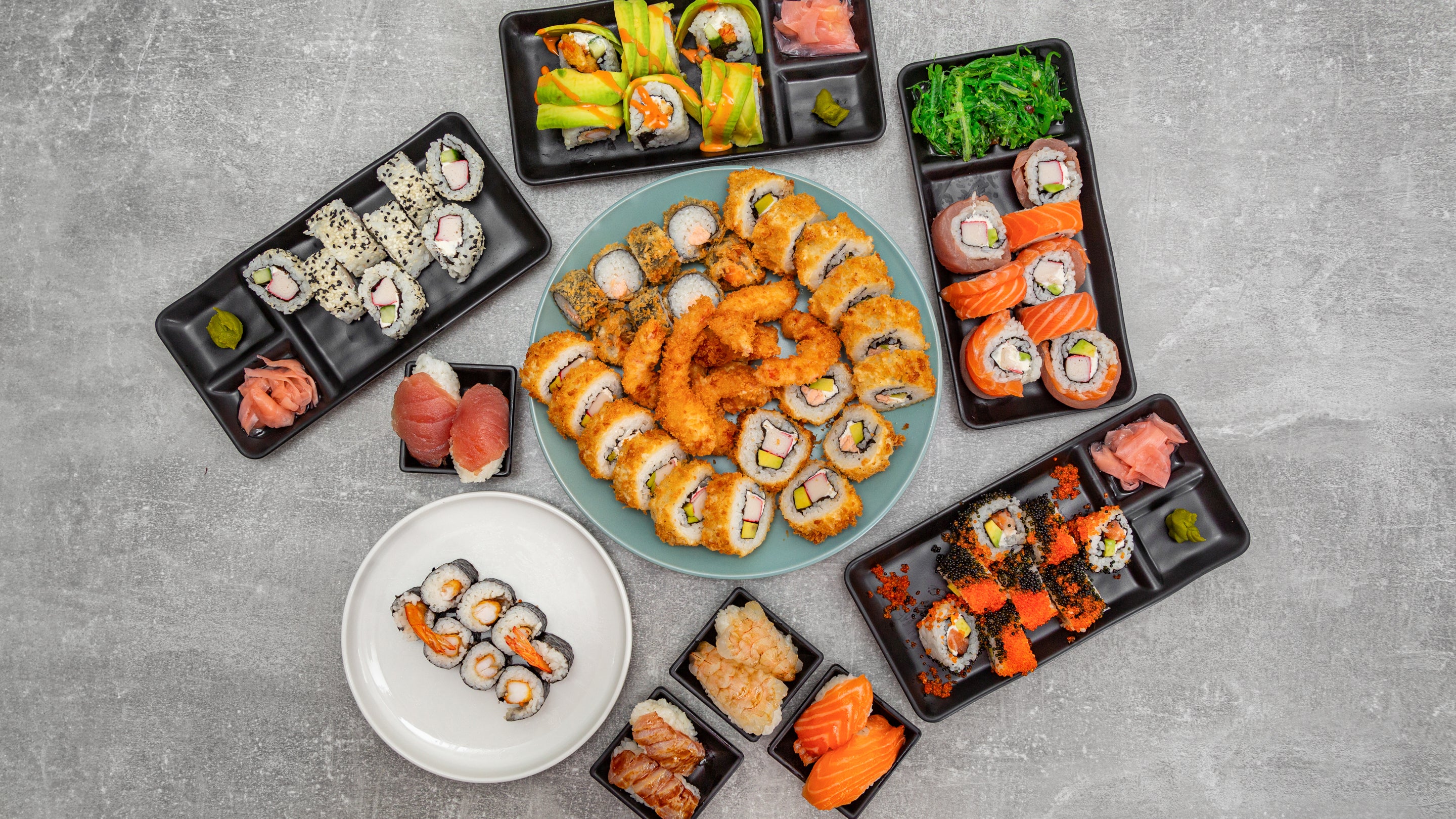 +4 soupe miso +4 riz nature + 4 salades 18 sushi assortiment 12 saumon roll 6 california 6 makis 6 printemp roll69,80 €