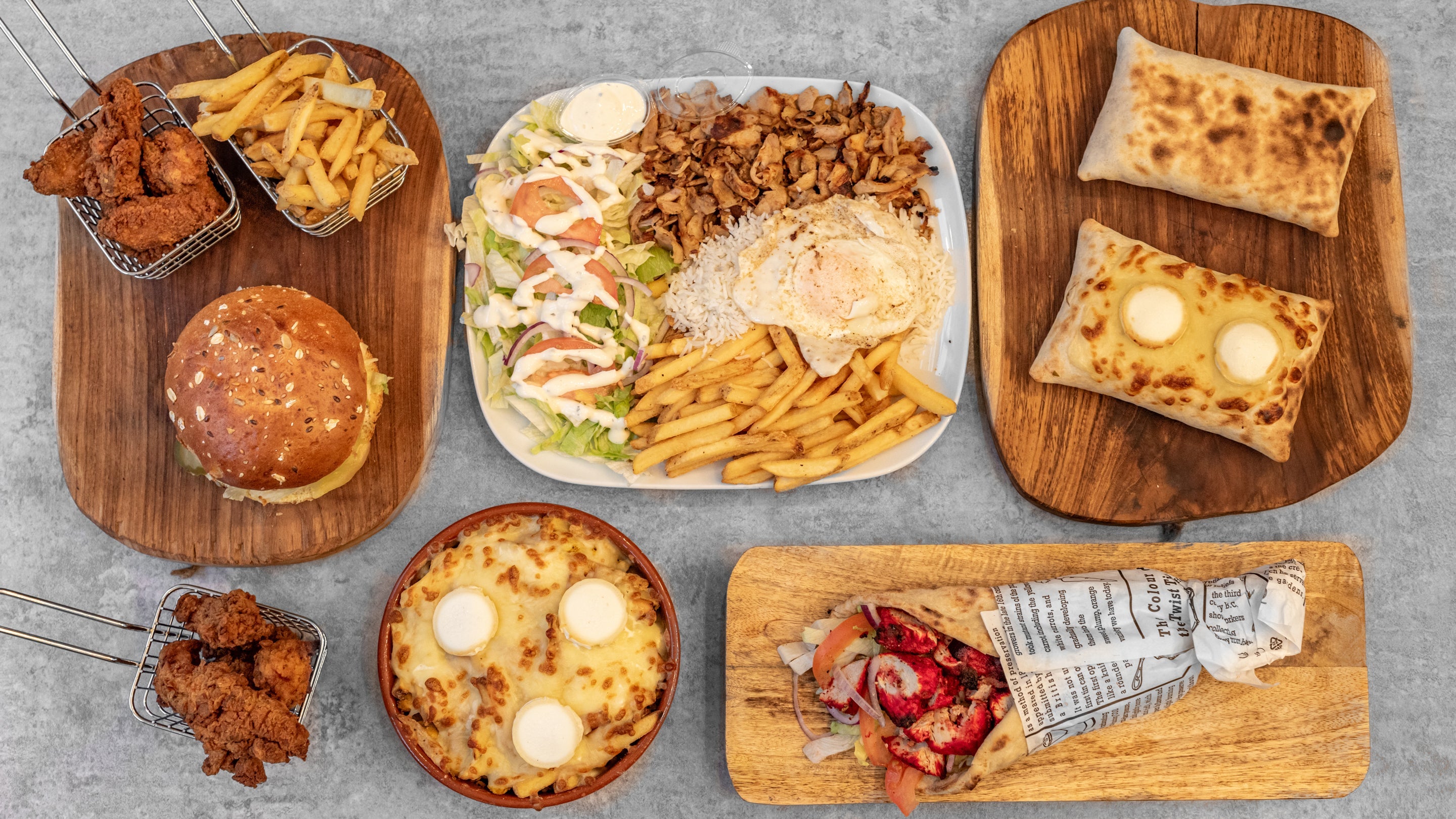 Base au choix, 2viandes au choix , gratiné au choix , sauce gruyère et sauce au choix.