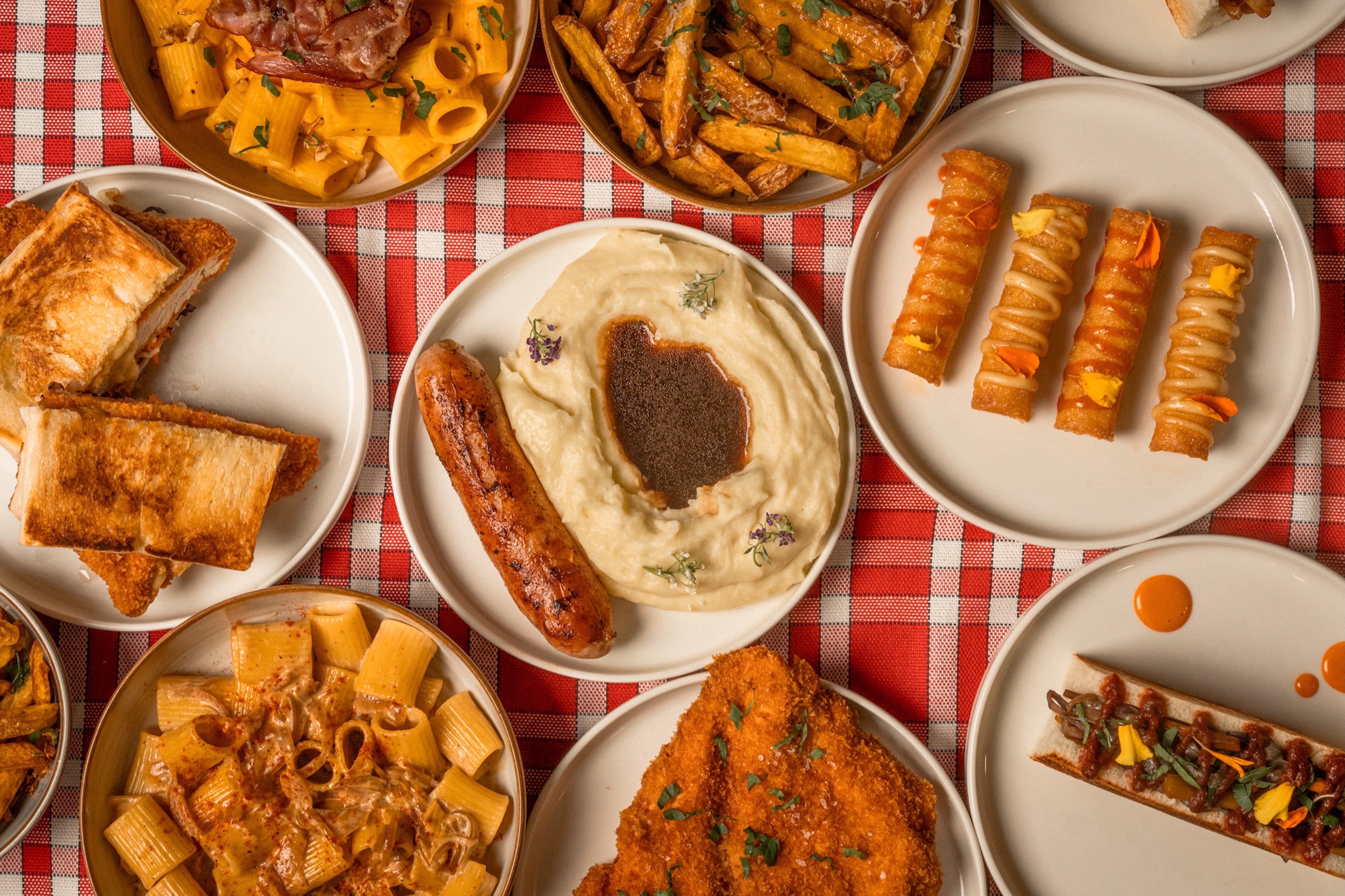 Saucisse, purée traditionnelle au beurre, crème et sauce brune au vin rouge, riche et savoureuse.