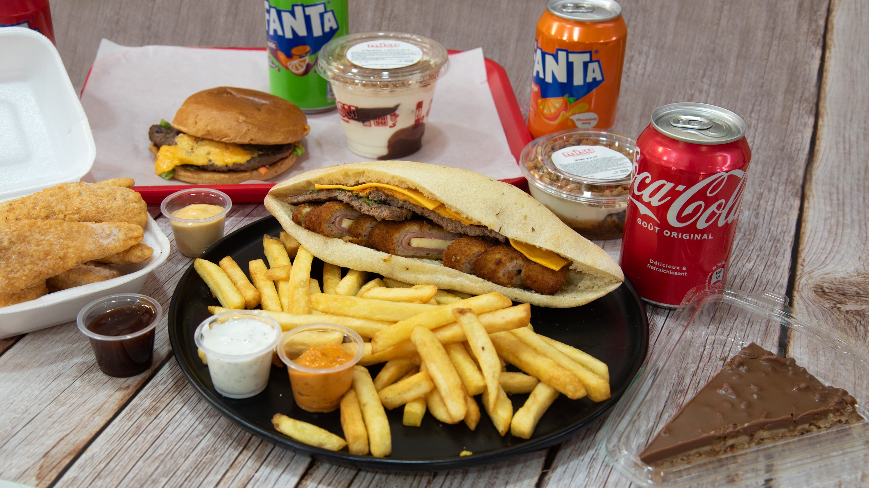 1 Cordon bleu, 2 steak, 2 carrés de fromage/ 1 cheese and turkey breaded, 2 minced beef, 2 slices of cheese10,00 €Méga