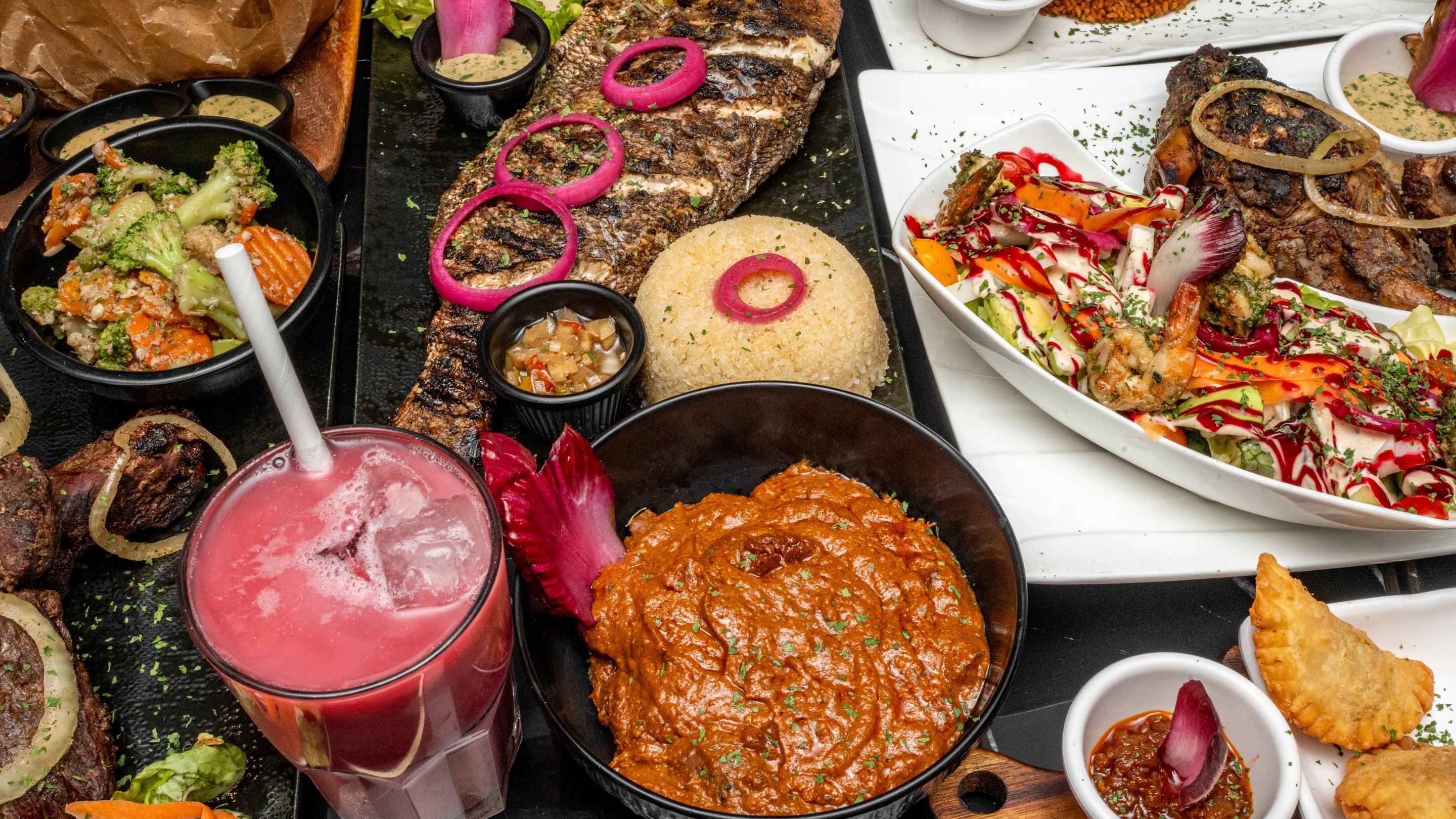 Morceaux de poulet marinés et côtelettes d’agneau braisées, servis avec accompagnement au choix37,00 €Dibi Poulets