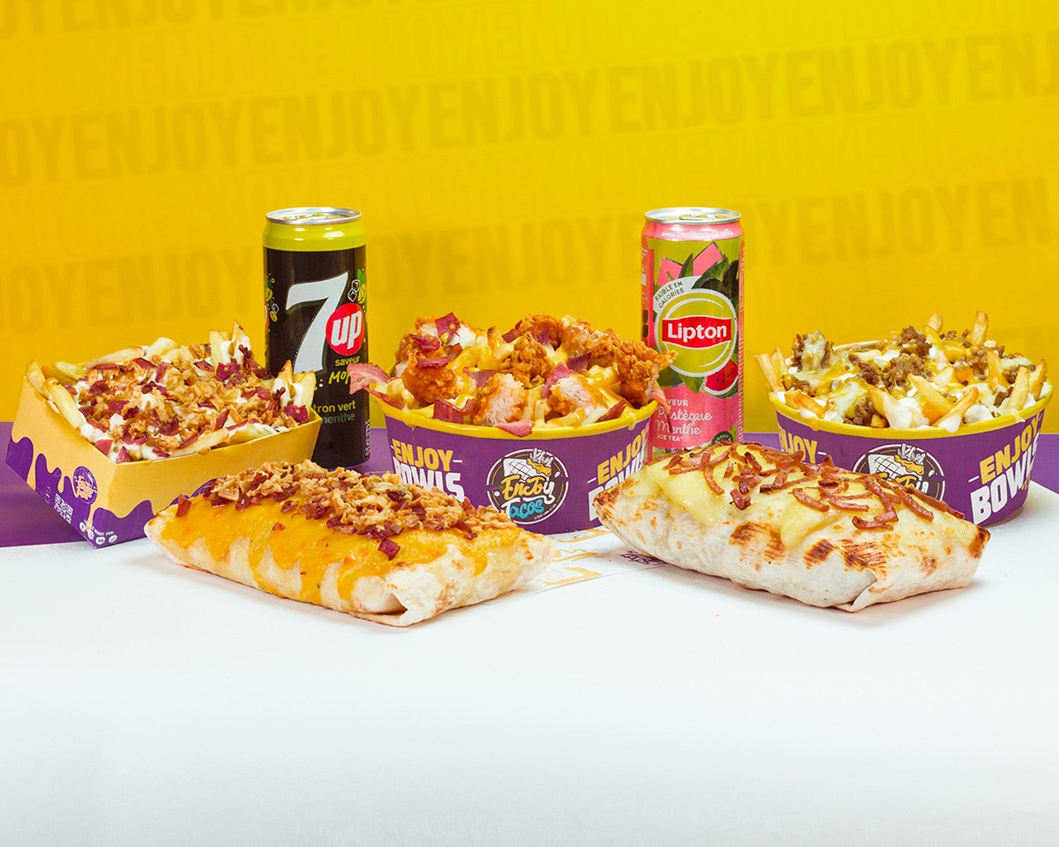4 galettes, 1 sauce, 5 viandes, choisis tes suppléments et ton gratinage. Tous nos Enjoy Tacos sont composés de frites et sauce fromagère maison€29.90